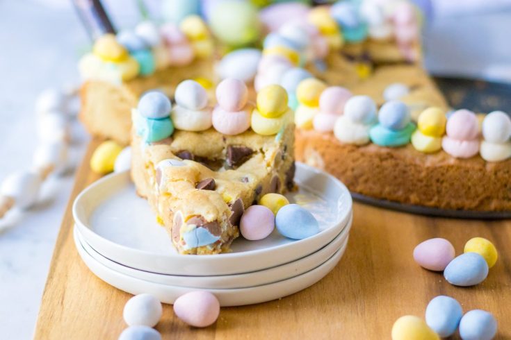 There is nothing I love more during the holidays than a cute dessert treat. This cookie cake is the perfect dessert or for your Easter table. A perfectly baked cookie cake studded with chocolate chips and mini cadbury eggs this cake is as delicious as it is adorable.