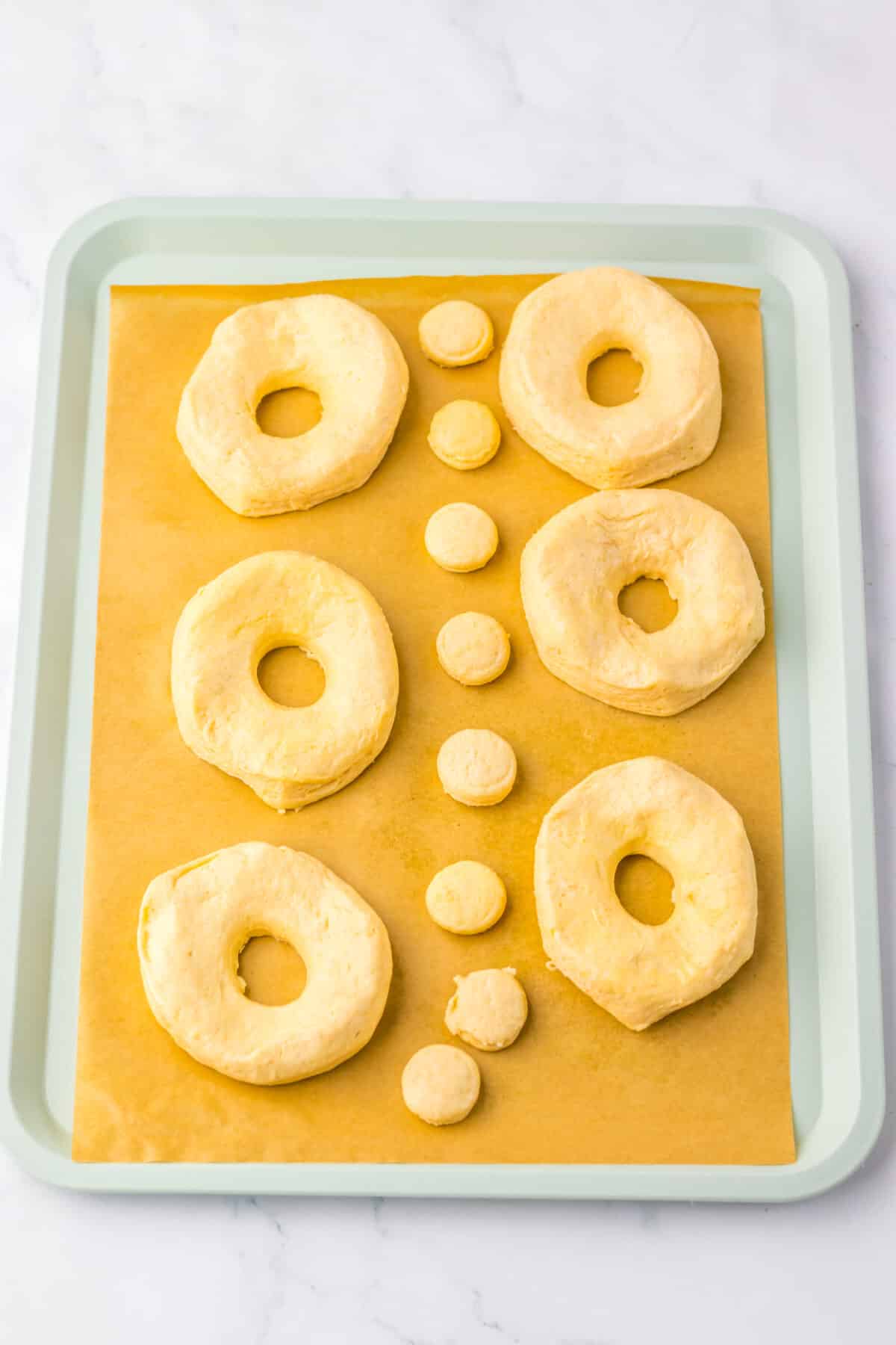 Separate the biscuits and use a small round cutter or water bottle cap to cut out the center of each. Save the holes, you can air fry those too!Air fry in batches