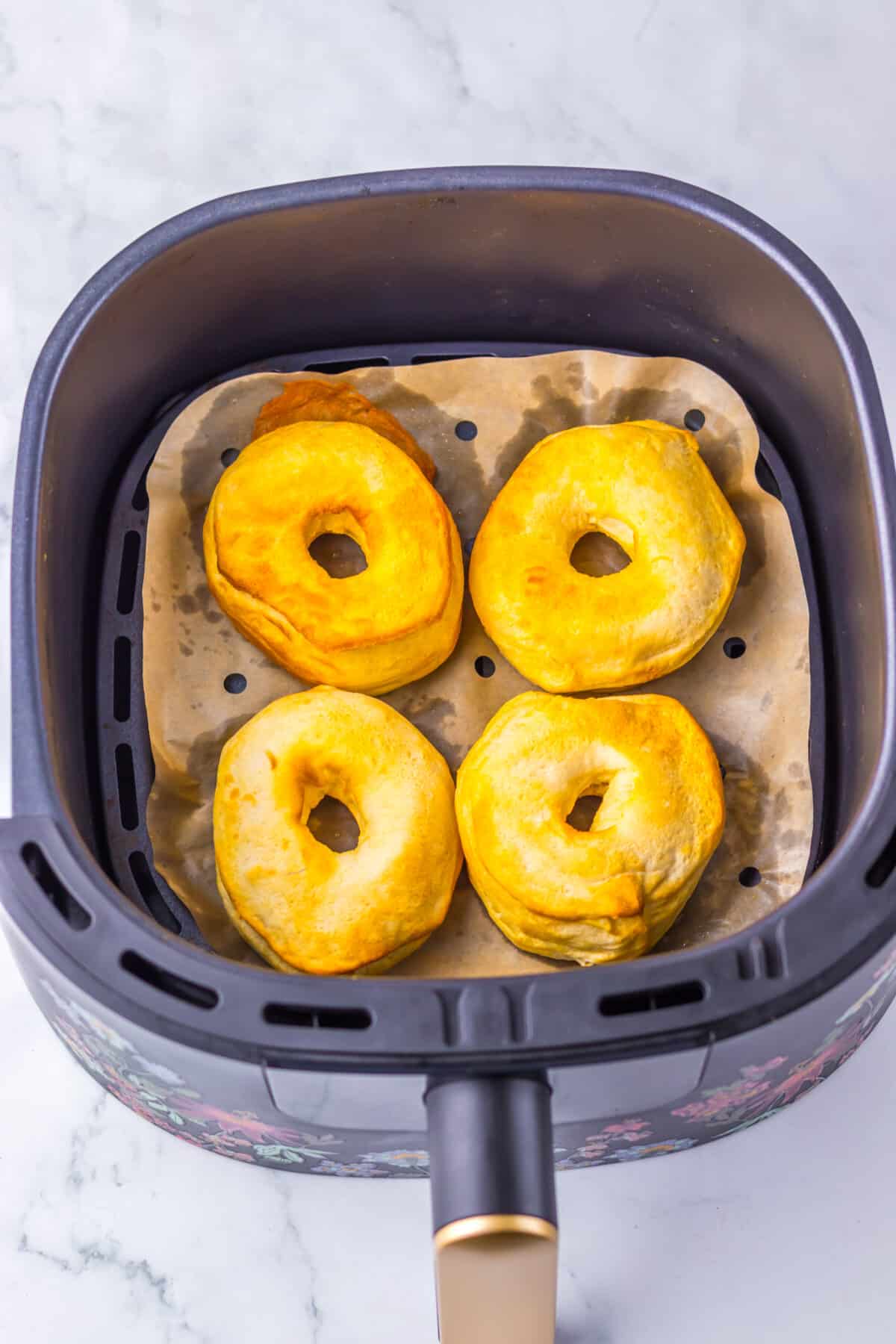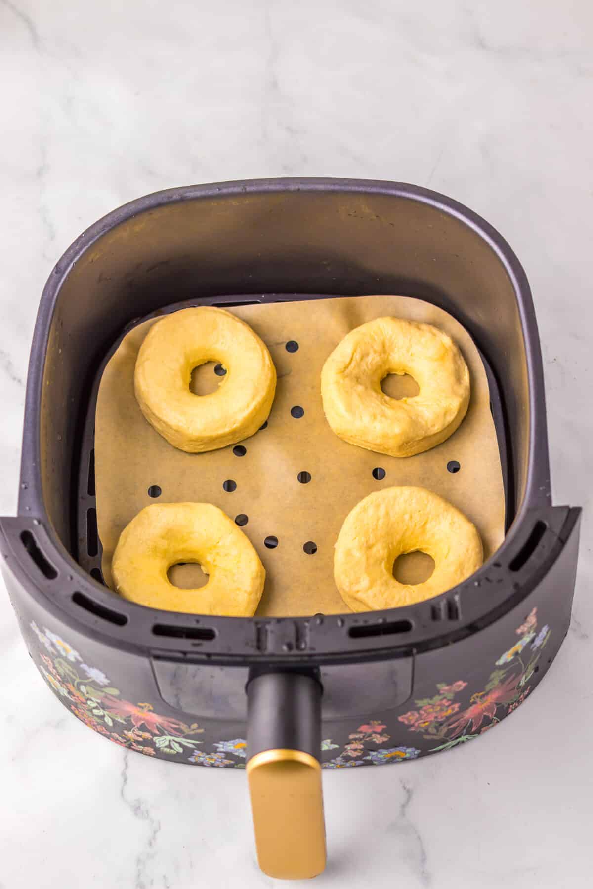 - Place 4 donuts in a single layer in the air fryer do not let them touch, if they do remove one.