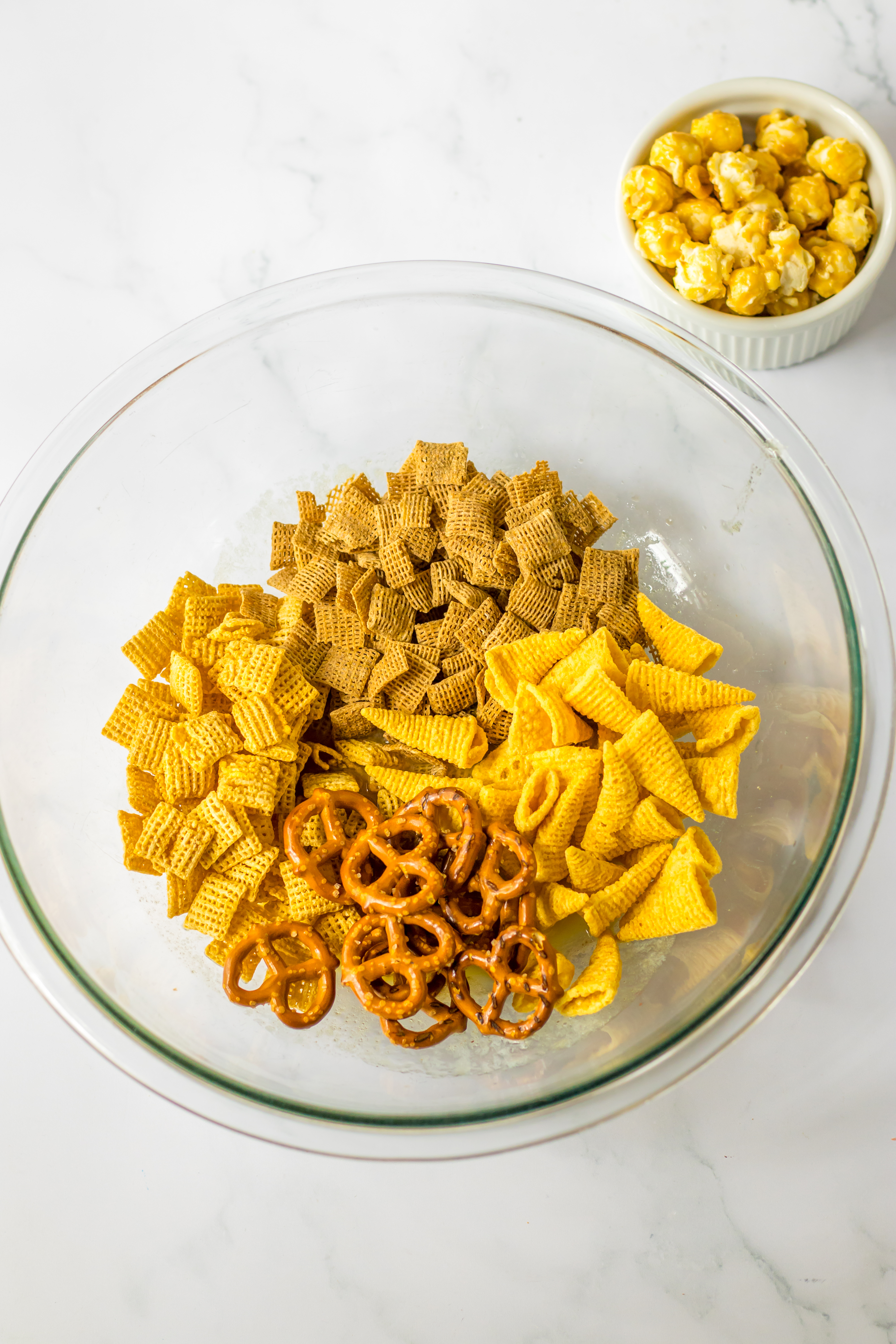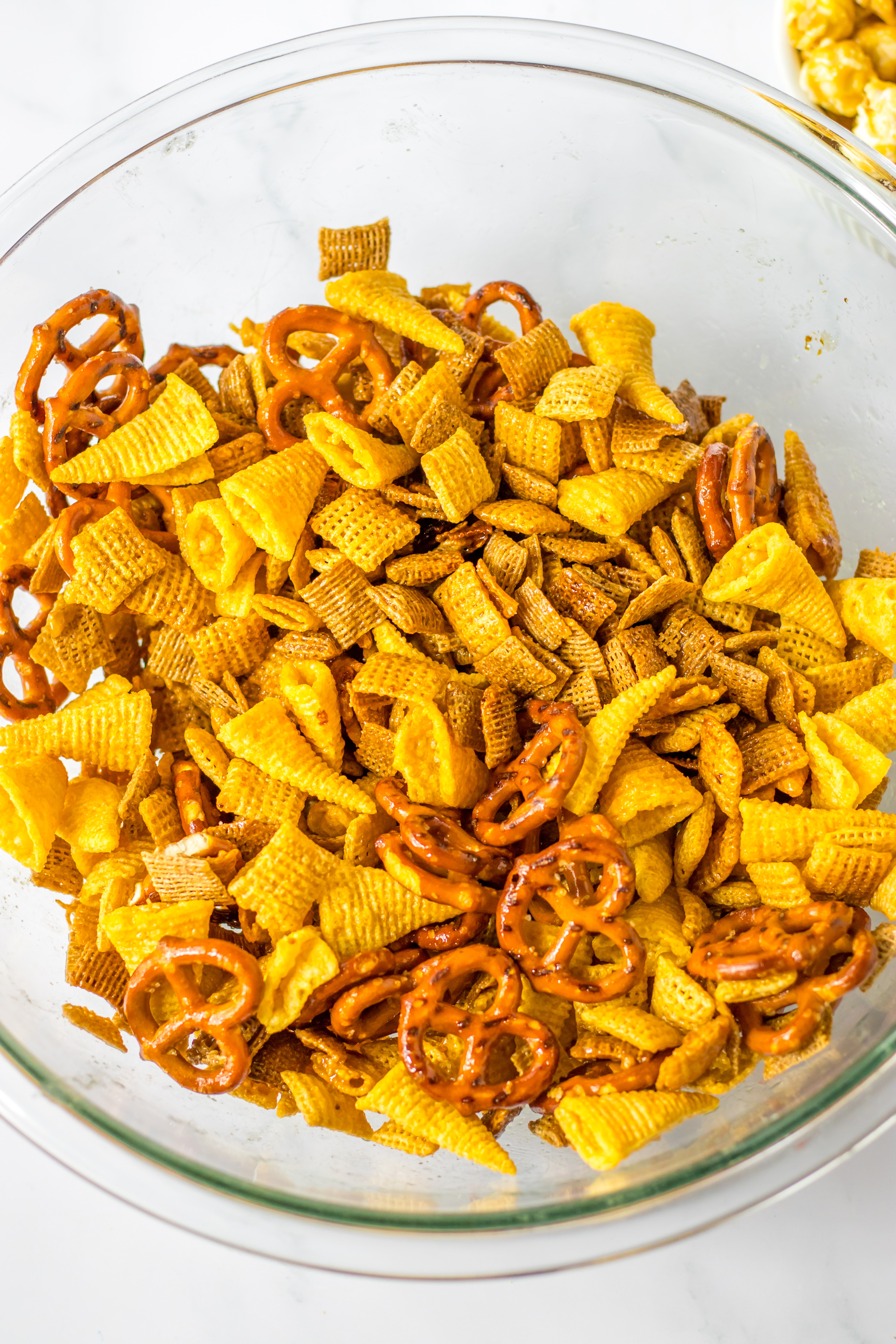- The bowl add your wheat chex, corn chex, pretzels and bugles.