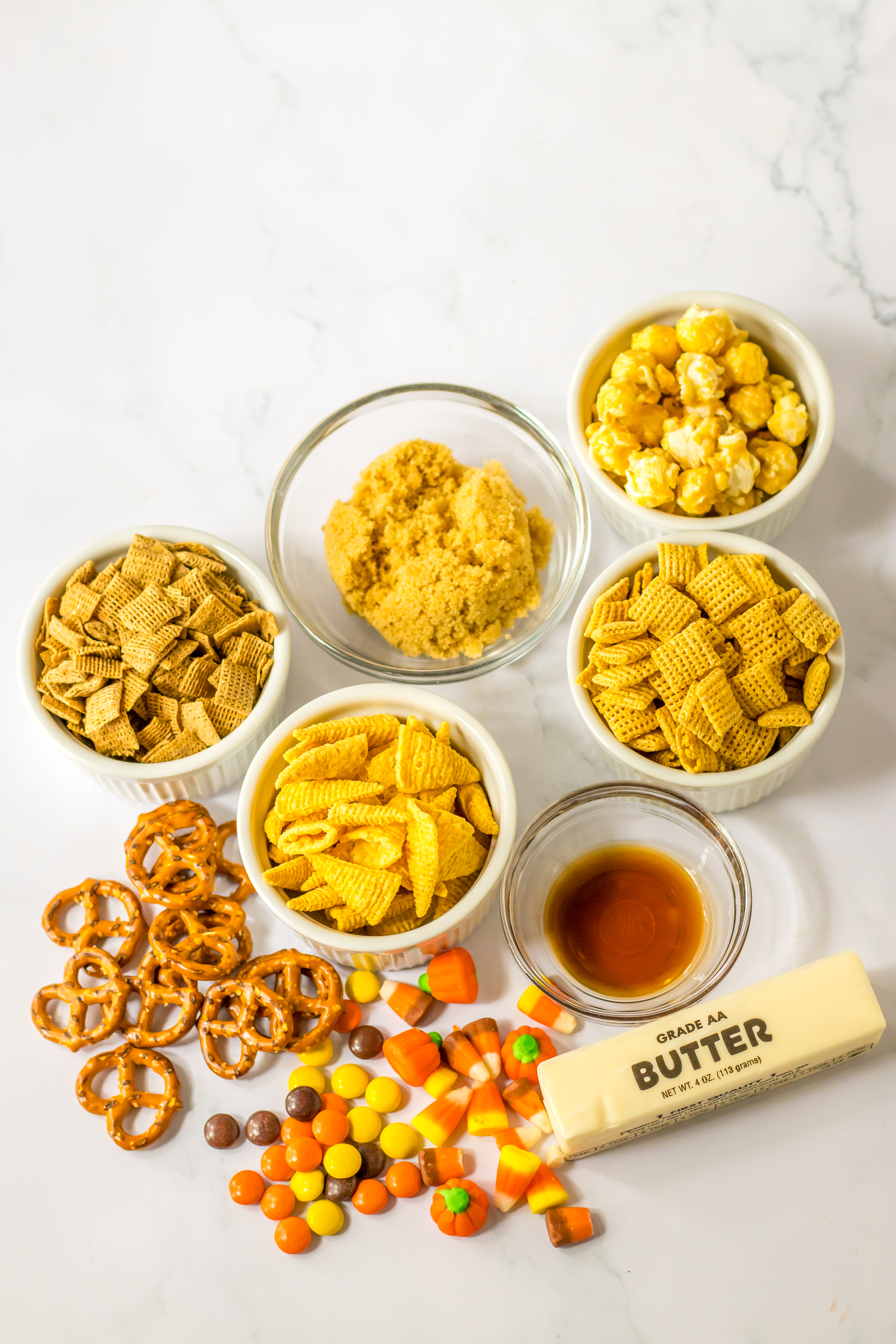 - Candy Corn and Pumpkins – These are so great and add sweetness to this mix.