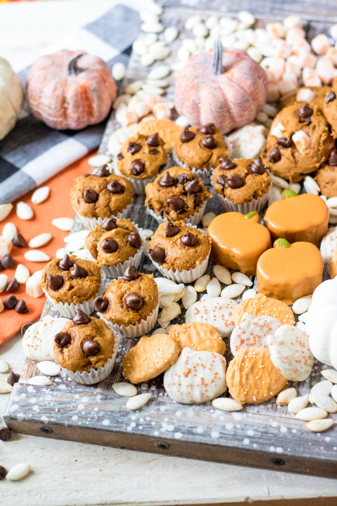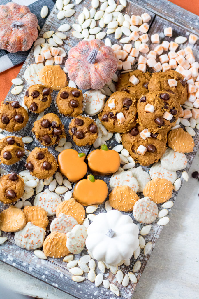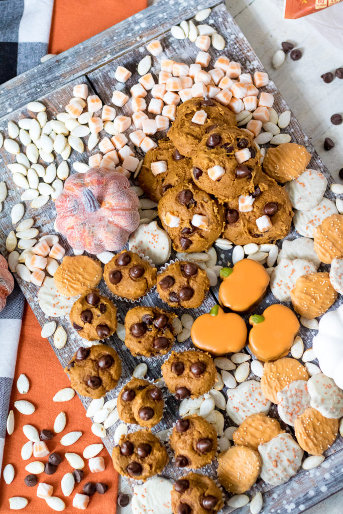 I was planning on having friends over, so I wanted to create a gorgeous fall dessert board with some pumpkin cookies and pumpkin muffins as the star of the tray.