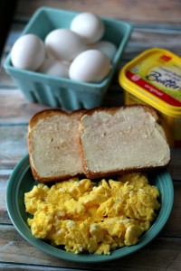 Dean loves loves loves scrambled eggs and I love using I Can’t Believe It’s Not Butter! recipe for Fluffy Eggs.