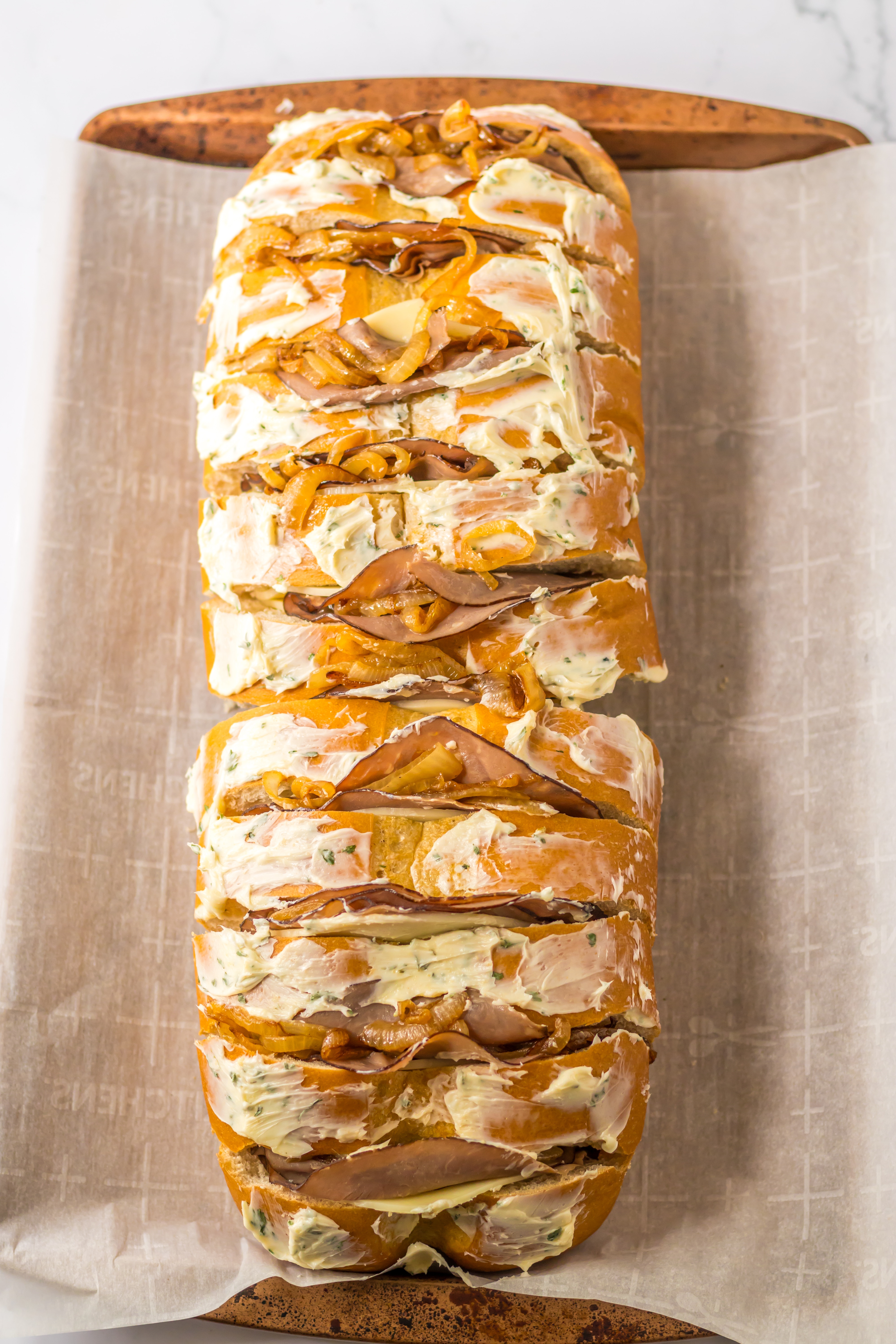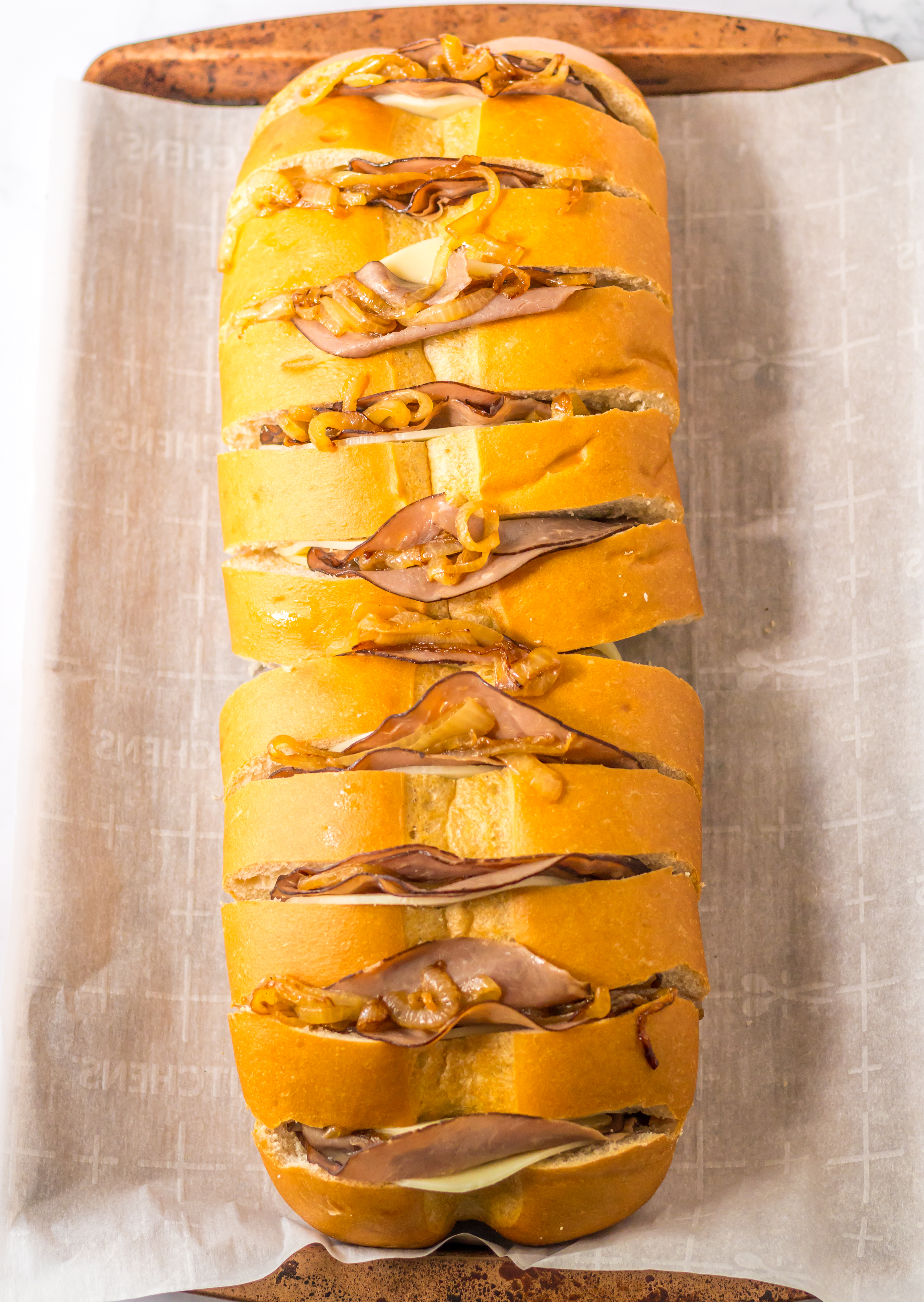 - Spoon some of the caramelized onion into each slice in the bread, optional.