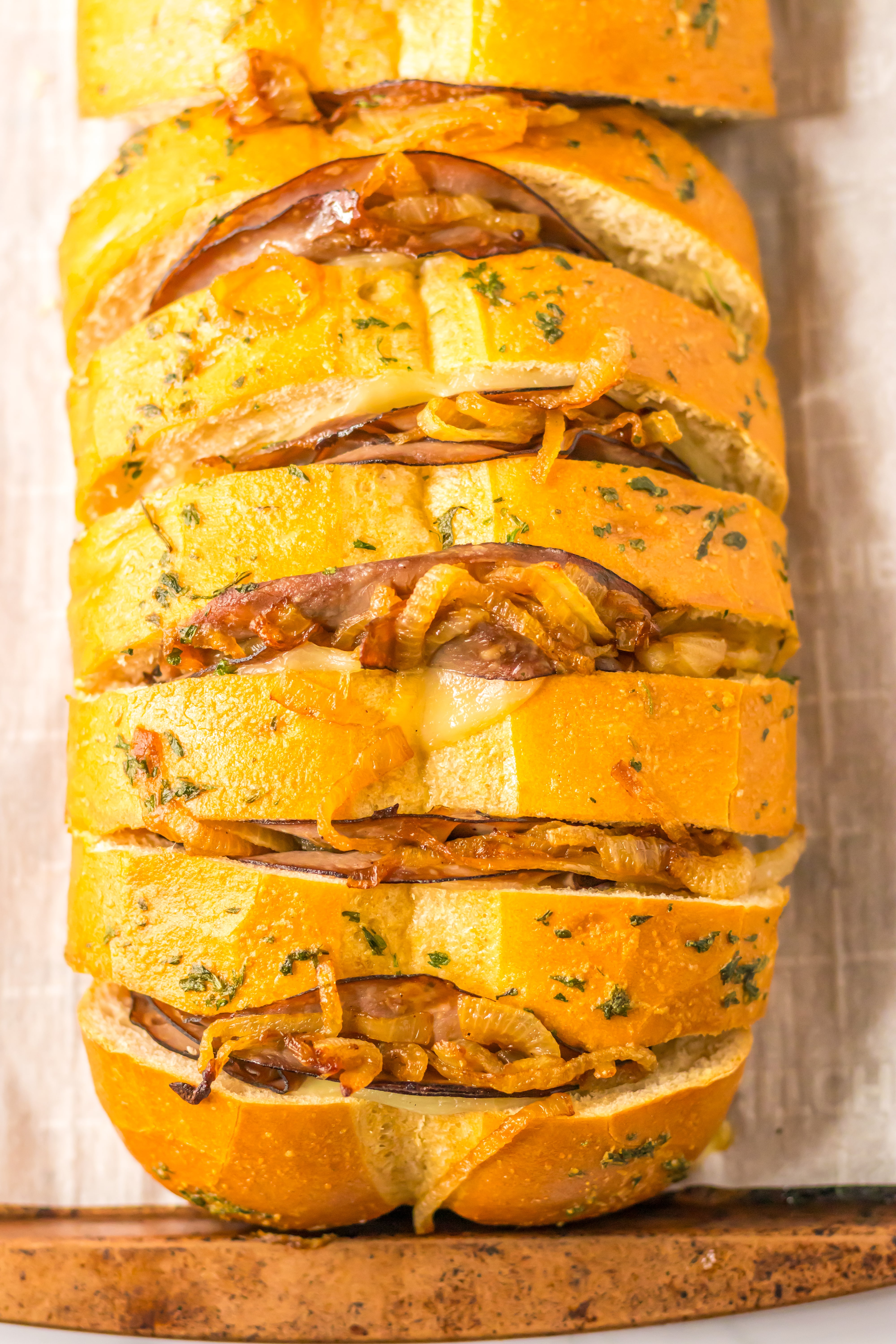 You just buy a big loaf of italian bread, make some slices in it and fill it up with caramelized onions, flavorful roast beef and melty provolone cheese. The whole loaf gets brushed with a seasoned butter before it’s baked to gooey cheesy perfection. I serve some beef consomme on the side for dipping and it is so good!