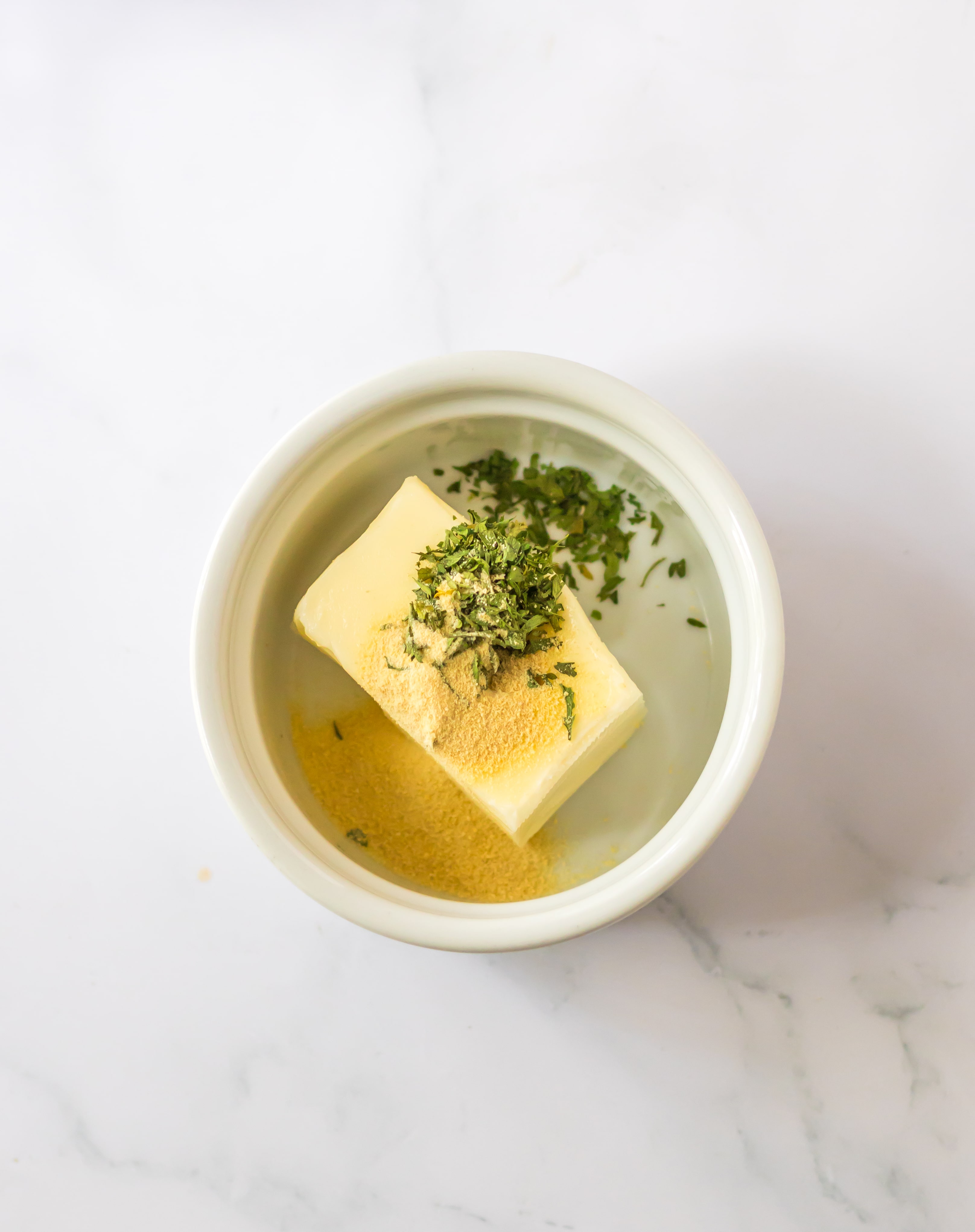 - In a small bowl combine the softened butter with the garlic powder and dried parsley.