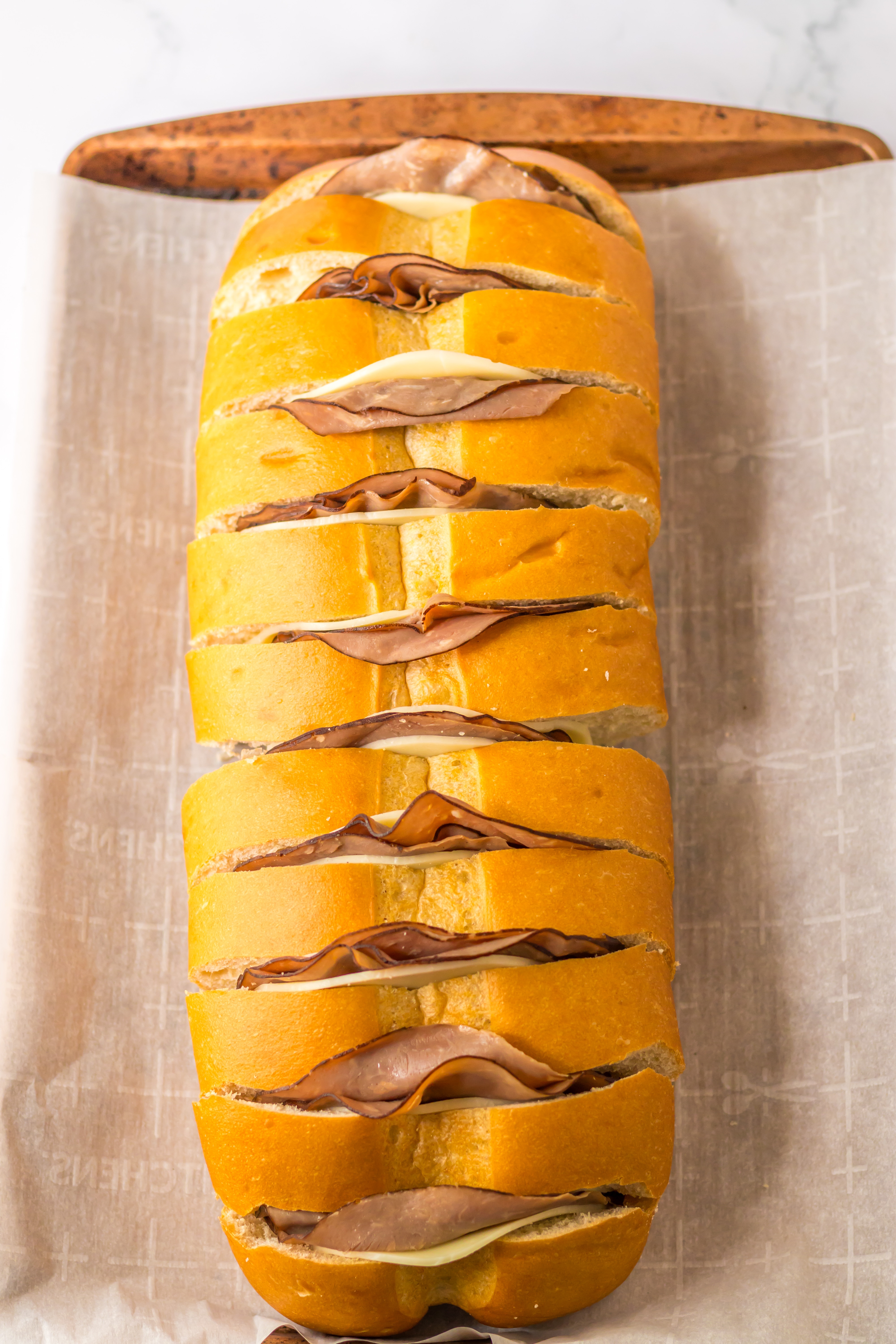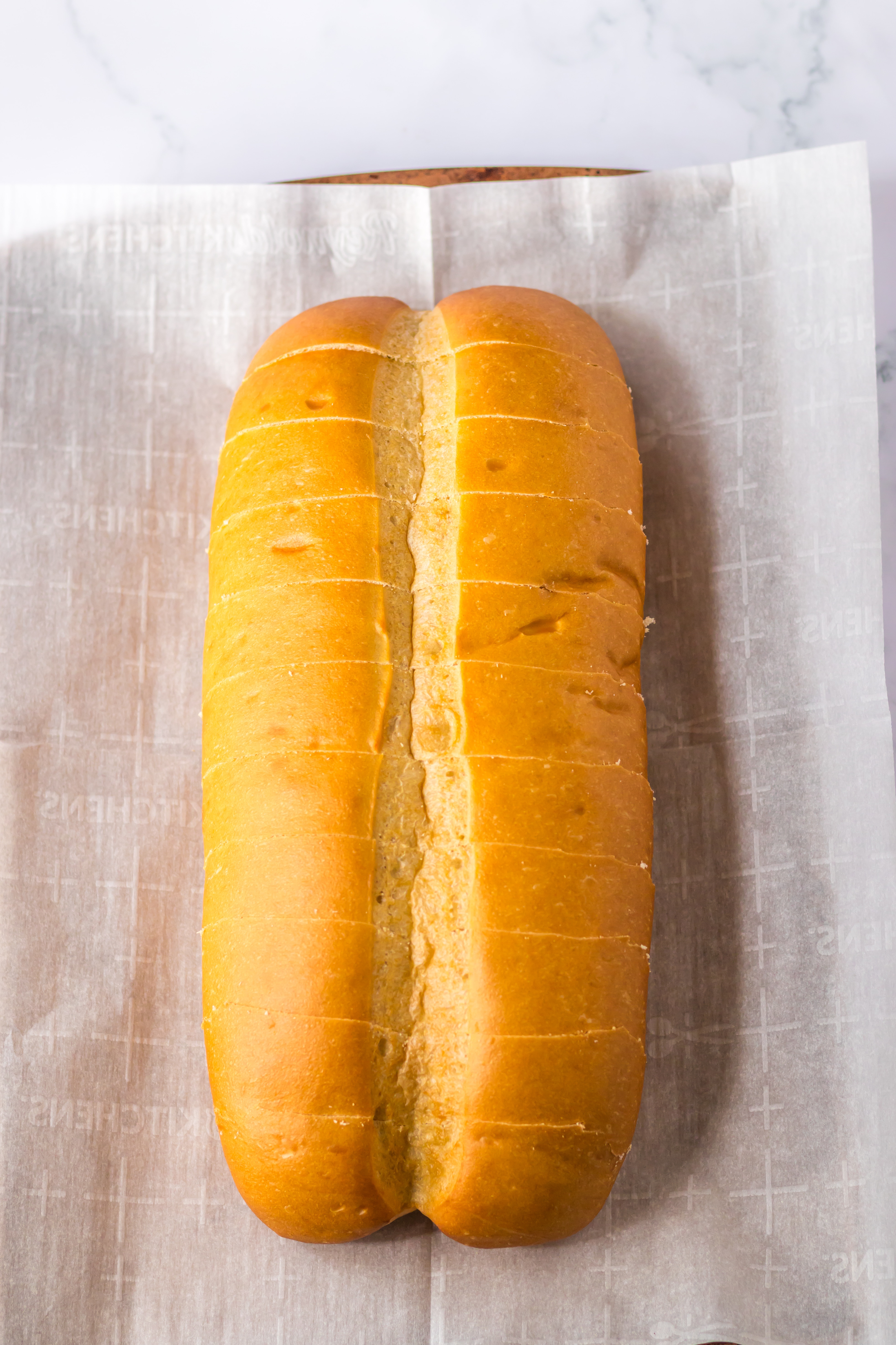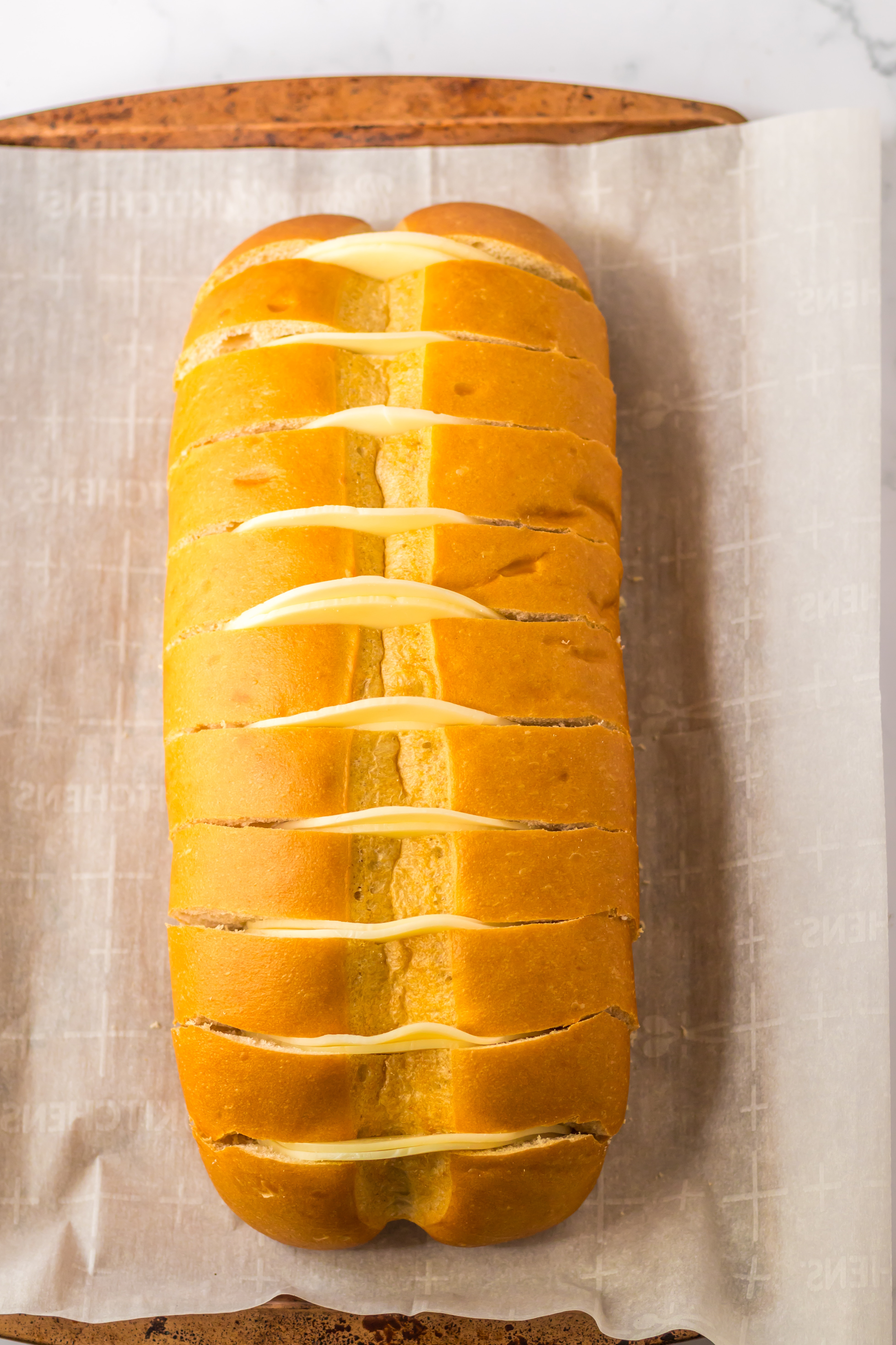 - Slice about 10 slices into your bread, do not cut all the way through the bread!