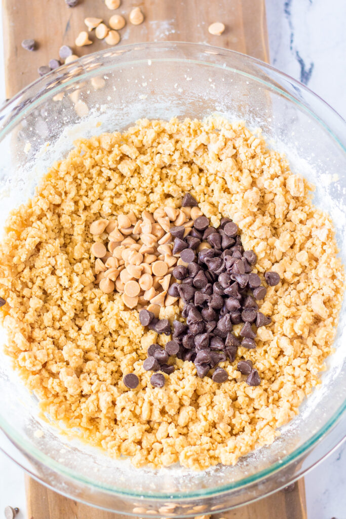 - Add 1/4 cup semisweet chocolate chips and 1/4 cup peanut butter chips and stir into the dough.