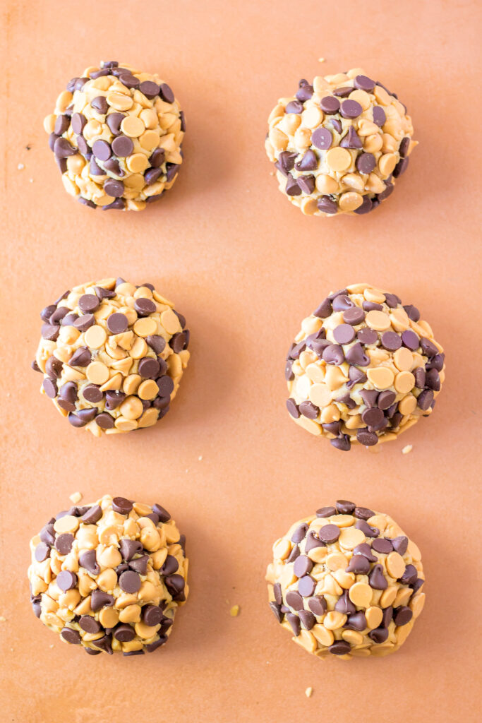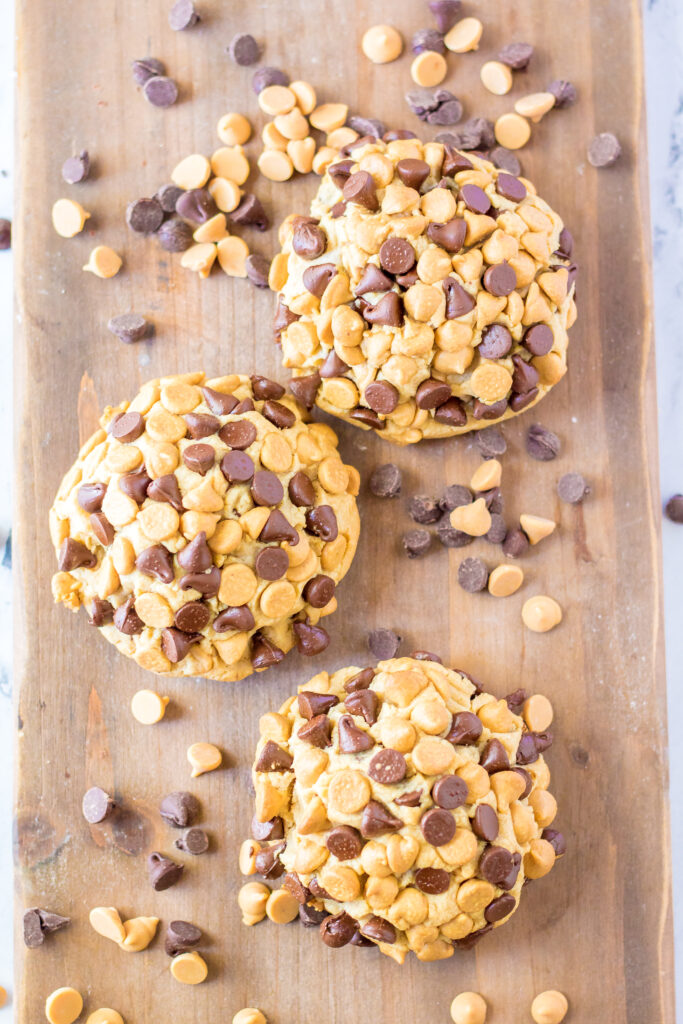 - Next press the remaining chocolate and peanut butter chips all over the top and sides of the cookies.