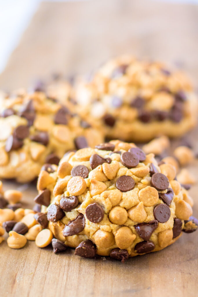 These Giant Peanut Butter Cookies are amazing. Soft, thick peanut butter cookies are covered in peanut butter chips and chocolate chips creating a truly decadent show stopping cookie.