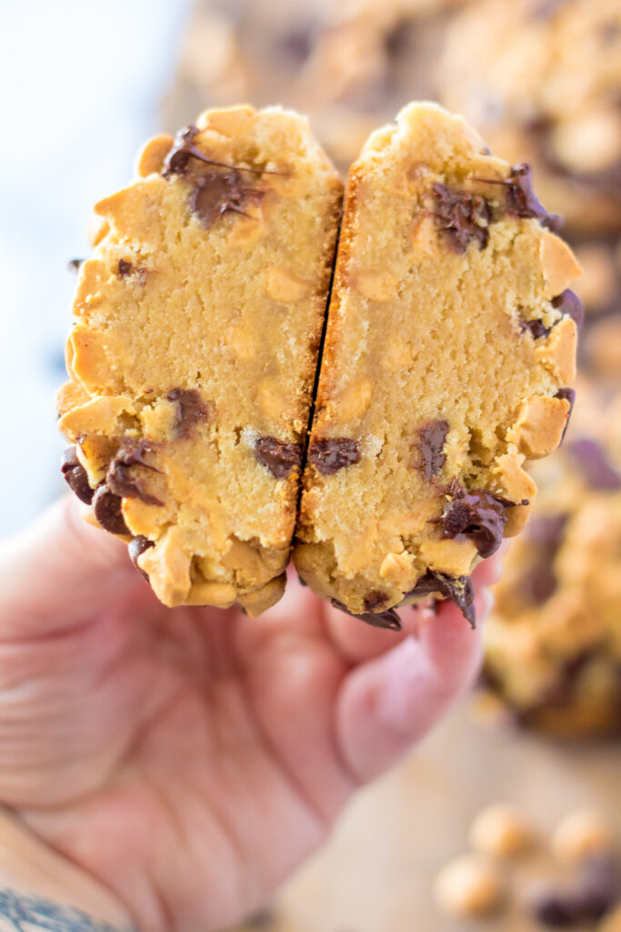 These Giant Peanut Butter Cookies are soft, thick and a bit chewy, everything the perfect cookie needs to be. The classic peanut butter cookie flavor shines here. I up the flavor and texture by coating the cookies heavily in chocolate and peanut butter chips which really puts them over the top!