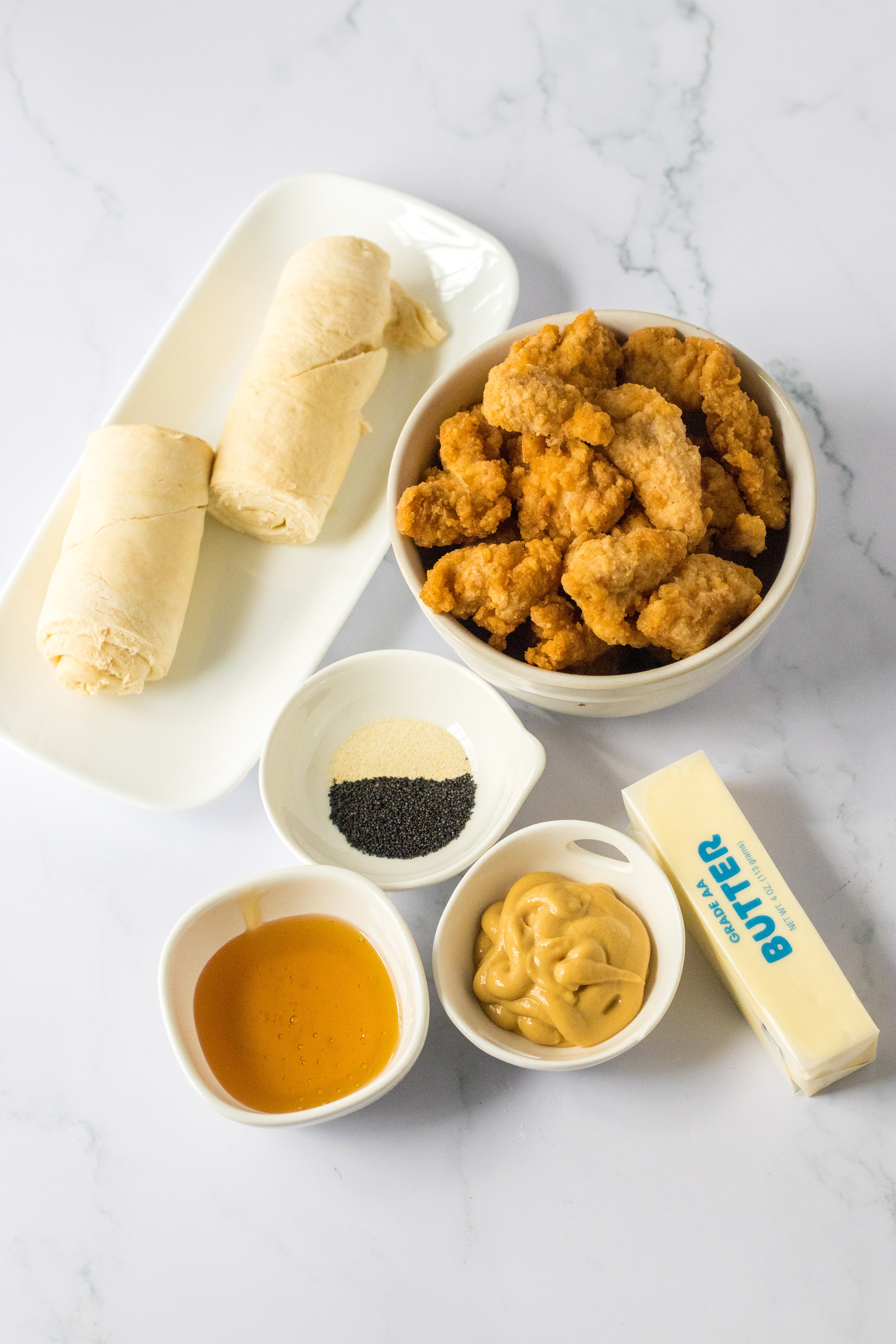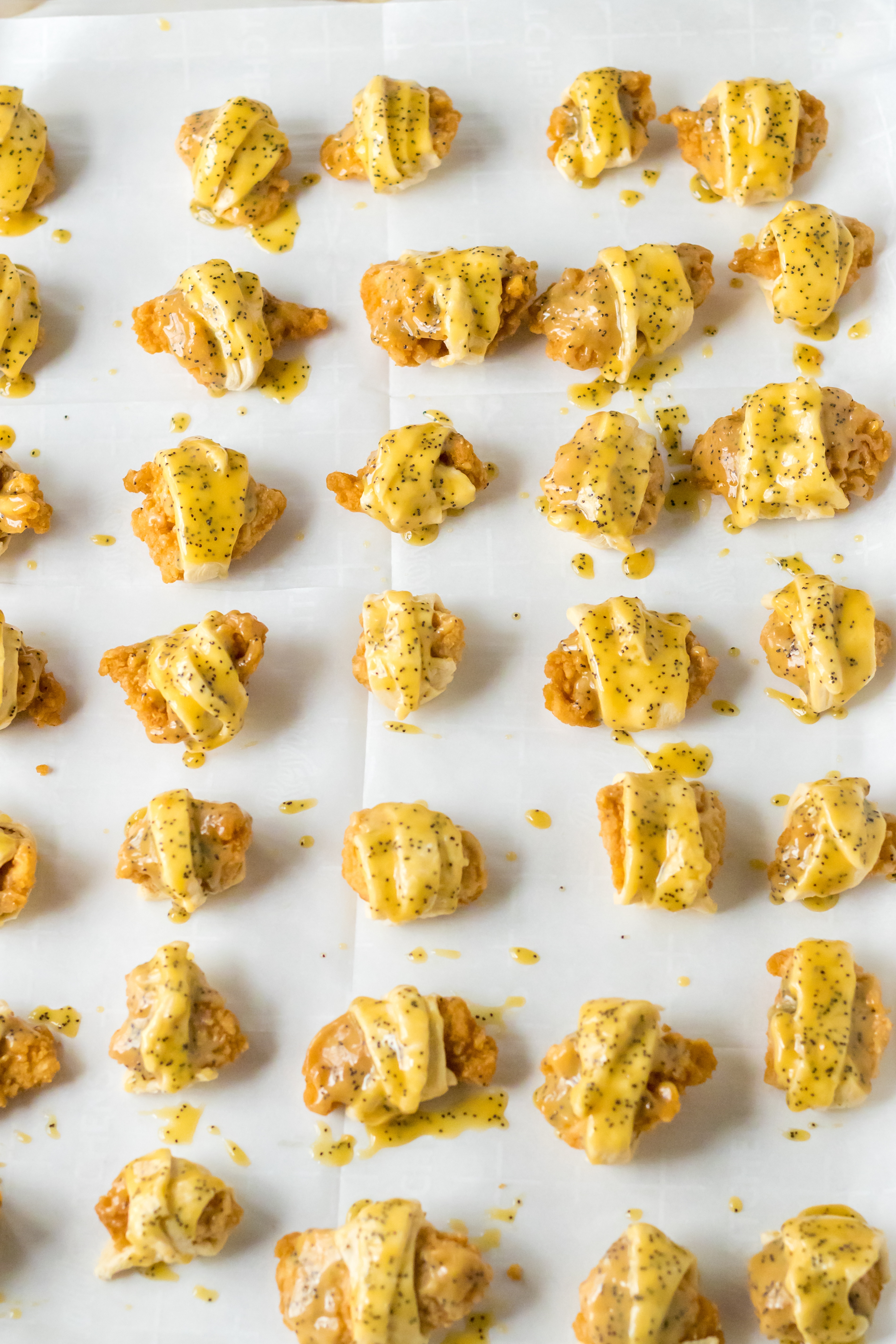 Popcorn chicken gets wrapped in crescent rolls and then glazed with a sweet and savory glaze made with honey, butter, mustard, poppy seeds and onion powder.