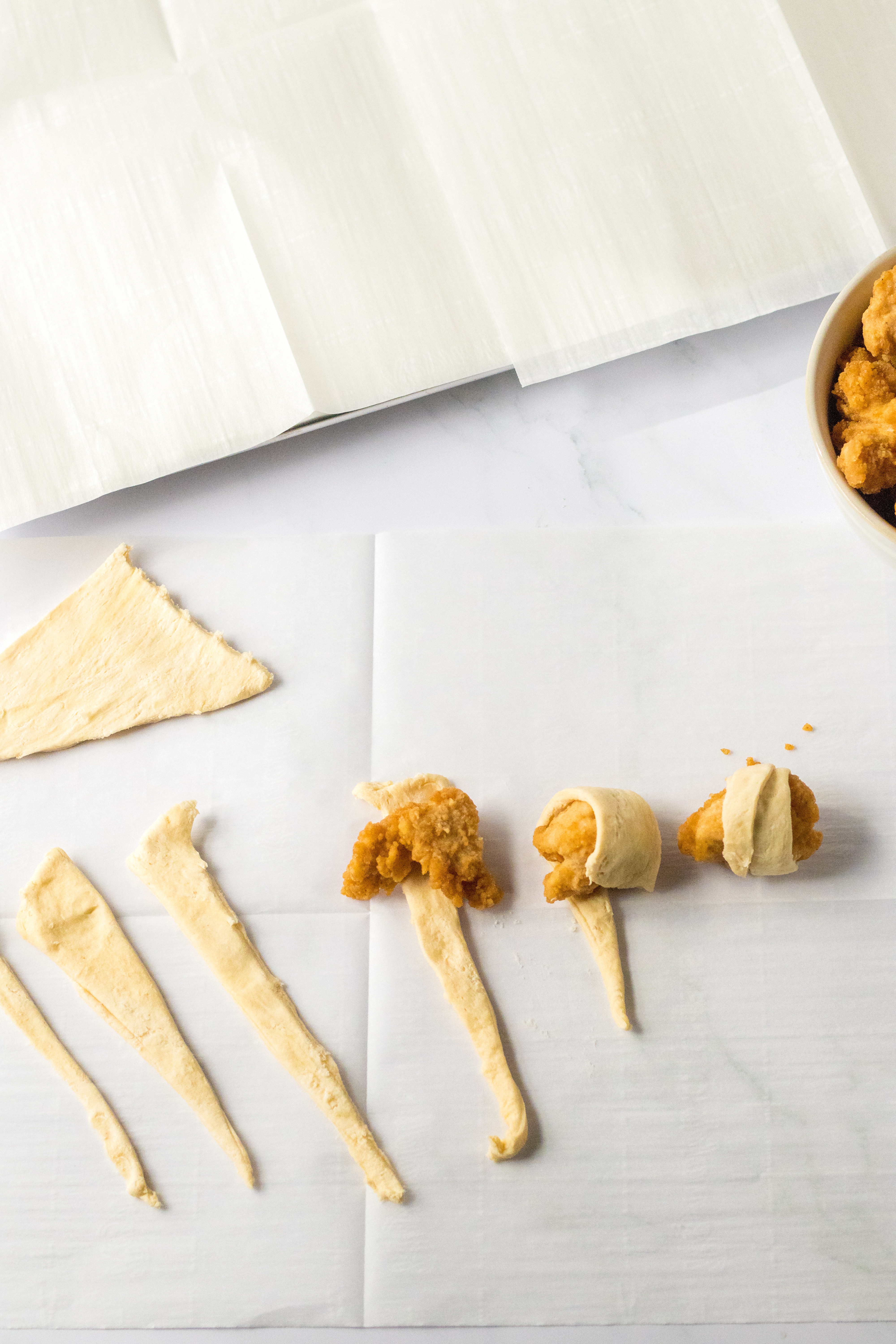 - Roll one piece of popcorn chicken in one piece of crescent roll.