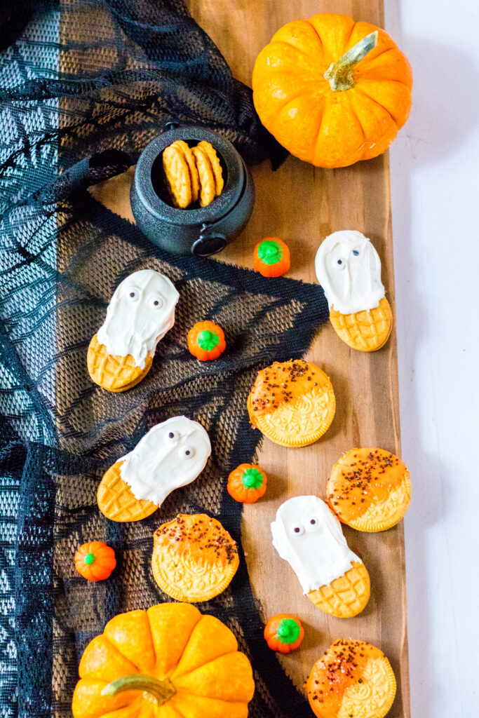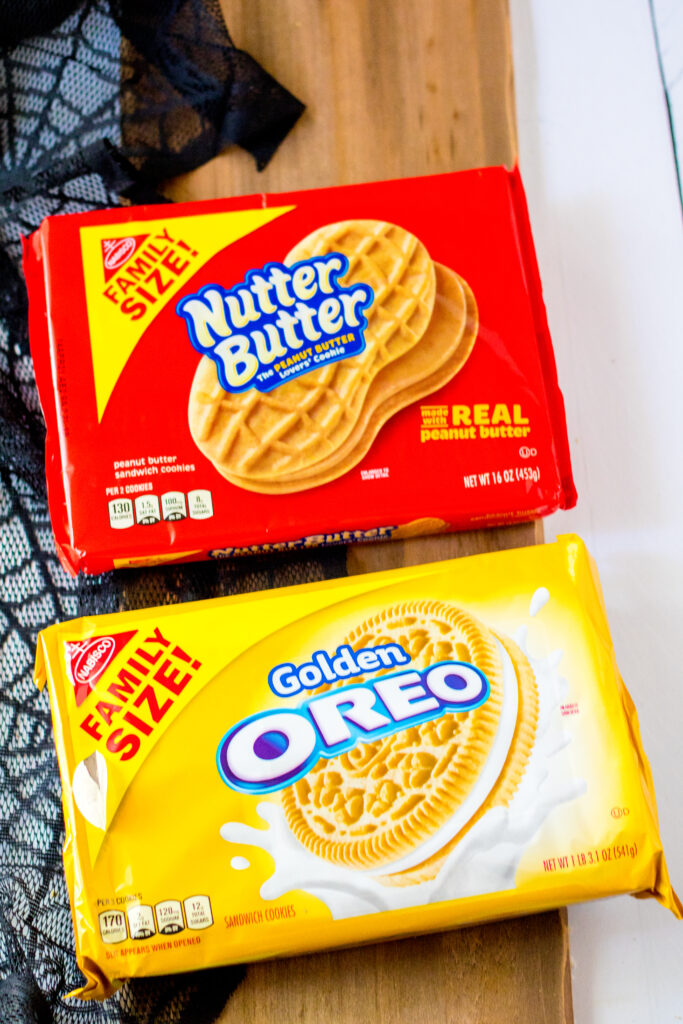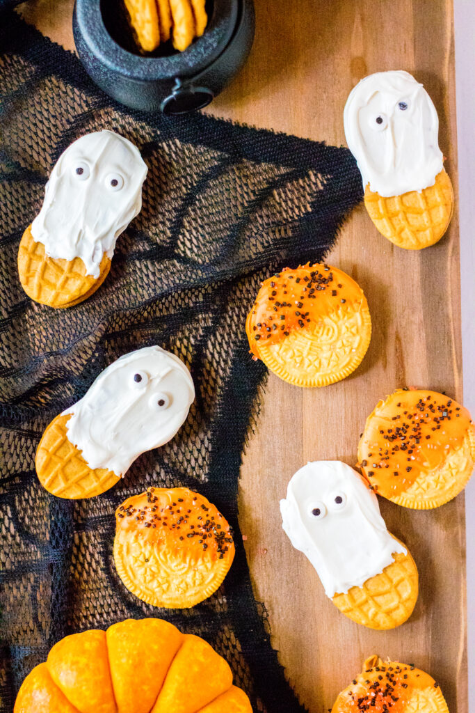 I decorated these cookies super simply. I loved adding white chocolate and candy eyes to the NutterButters to make them look like ghosts and I dipped the OREO cookies in orange chocolate and gave them a few sprinkles to make them pop.