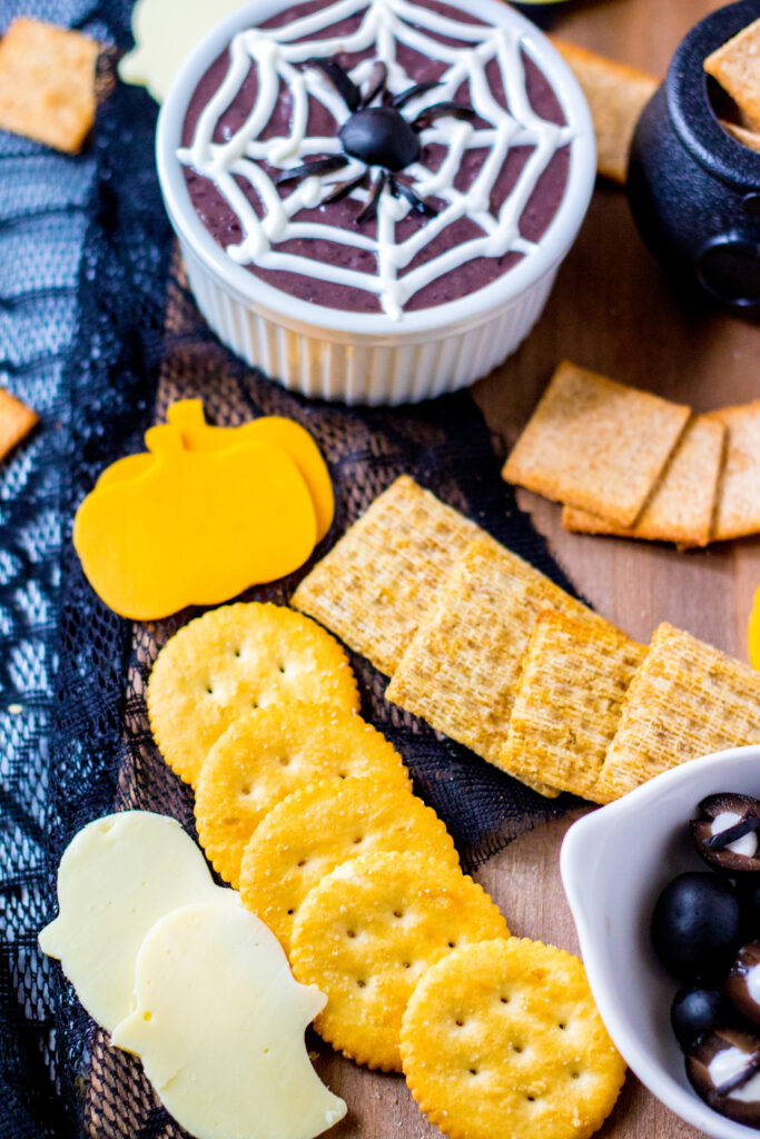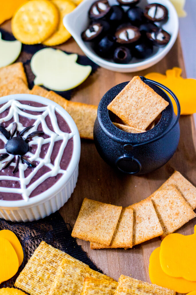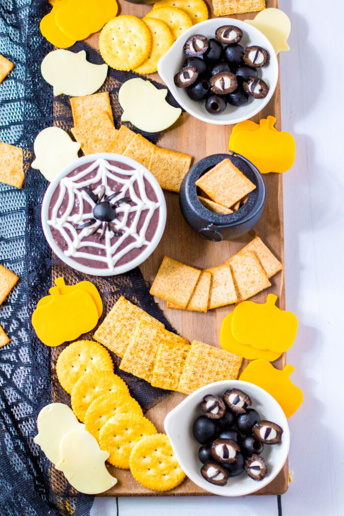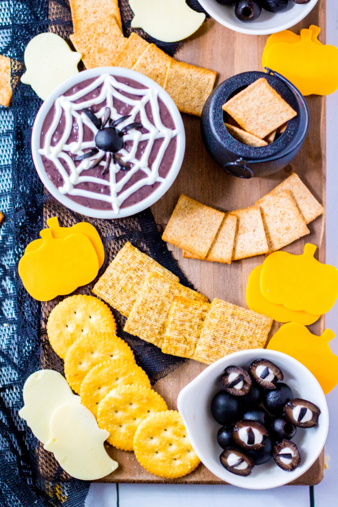 I filled up a few mini cauldrons with Wheat Thins and this board was ready to go for our monster movie night.