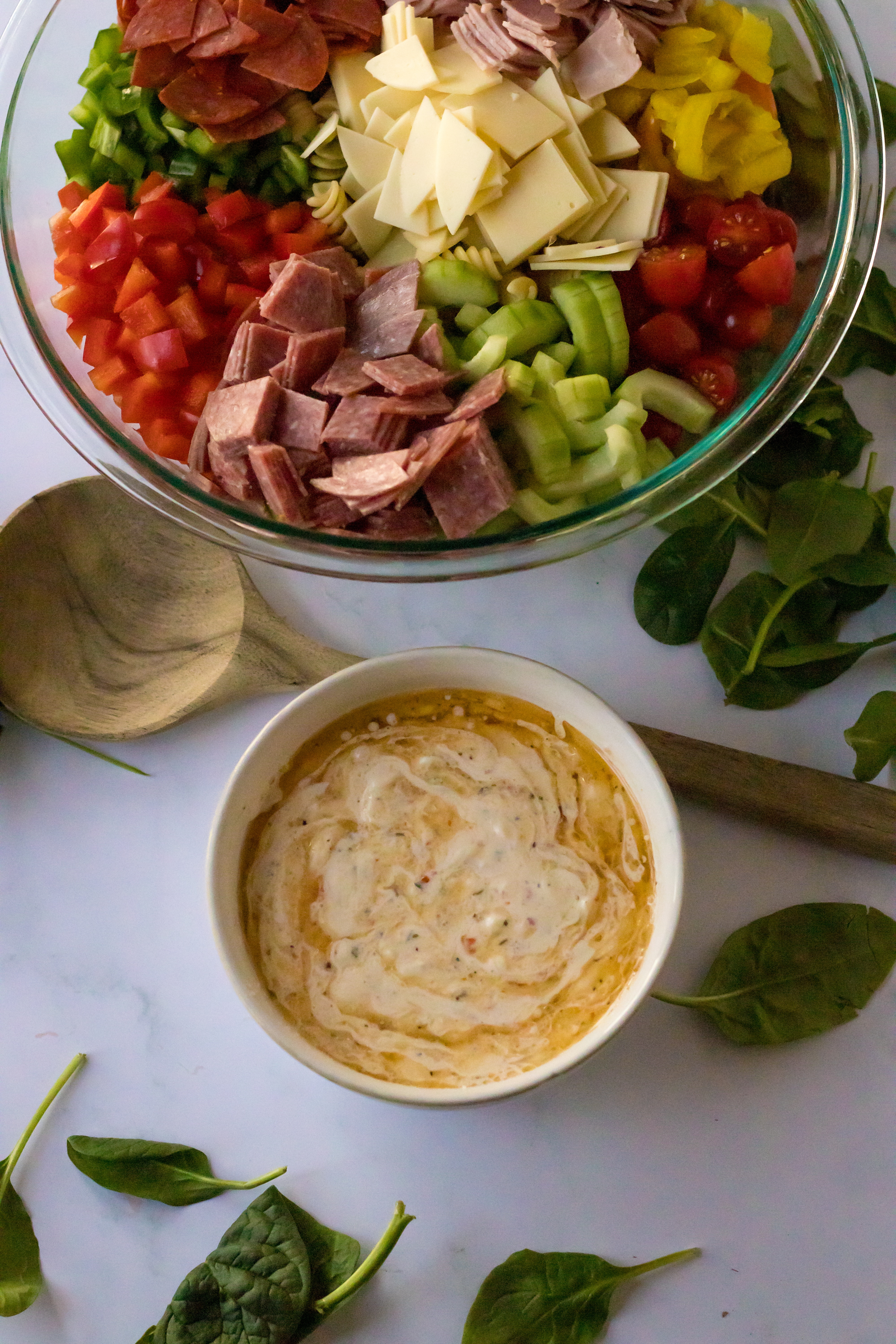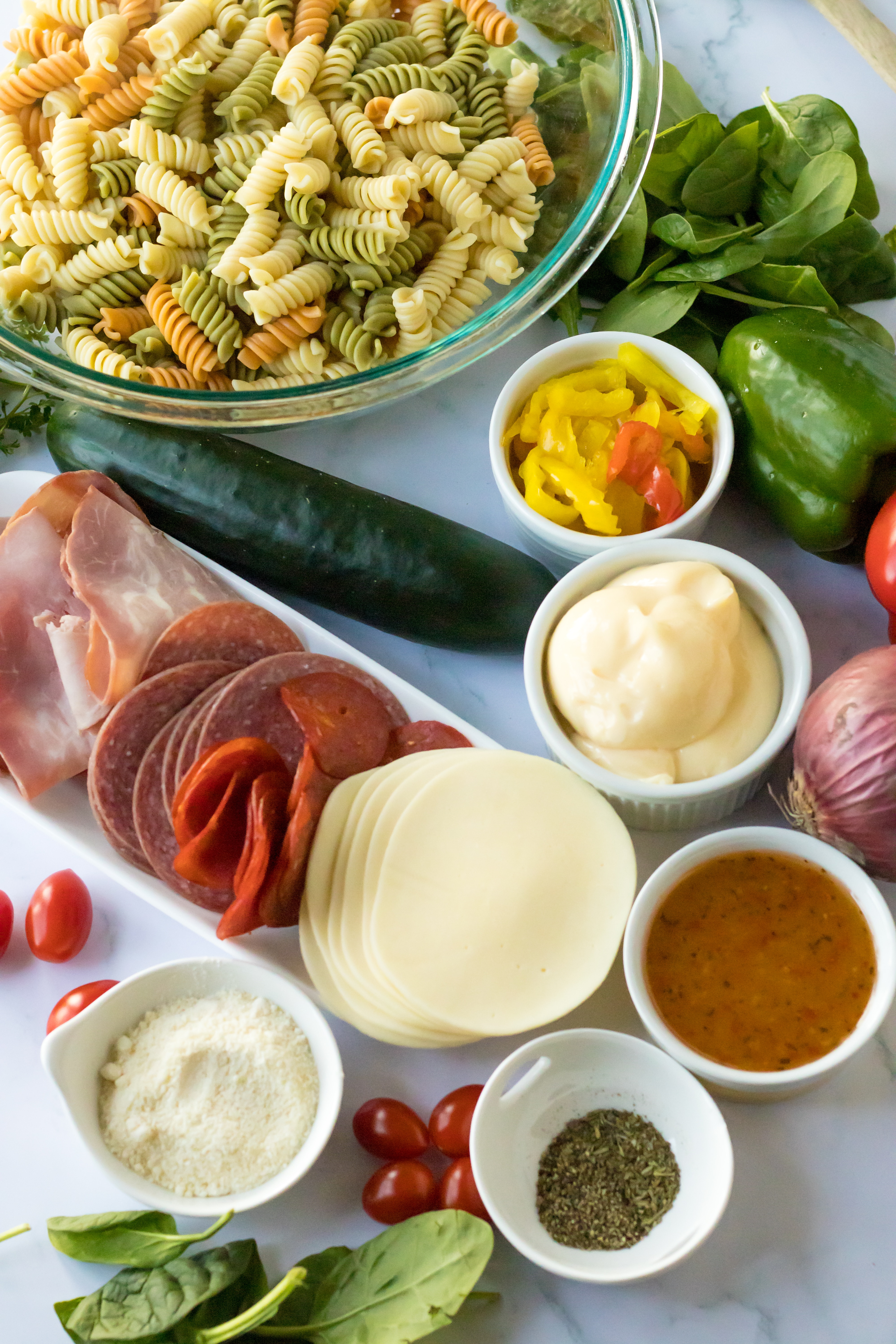 This is a great spin on that viral Hoagie Dip. I took all the elements of that delicious dip and added a few more veggies and pasta to create the best pasta salad ever!! This will be a big hit at any get together and is perfect for those upcoming warmer months!