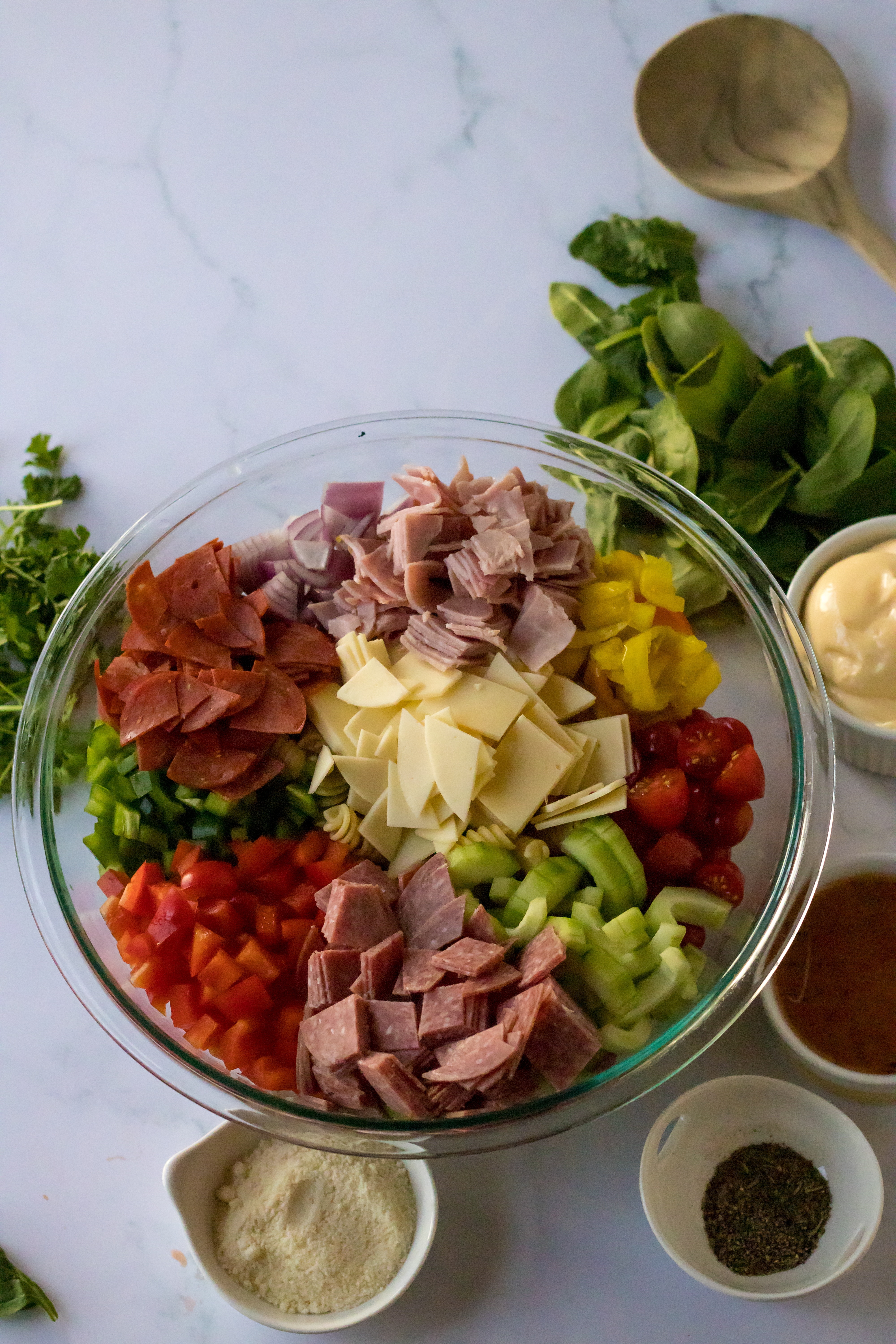 - In a large bowl combine the cooked pasta, cucumber, green bell pepper, red bell pepper, tomatoes, onion, spinach, salad peppers, salami, pepperoni, ham and cheese.