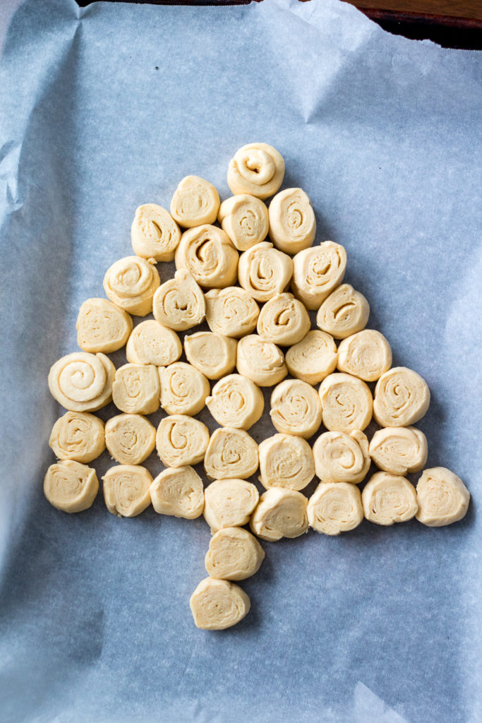 - On parchment lined cookie sheet place dough rounds into tree shape