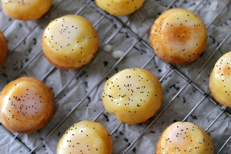 - Dip a cake into glaze and remove gently with a fork, place top side is down on cooling rack. Top with poppy seeds immediately. Repeat till all cakes are coated. Let stand until glaze is set, about 15 minutes.