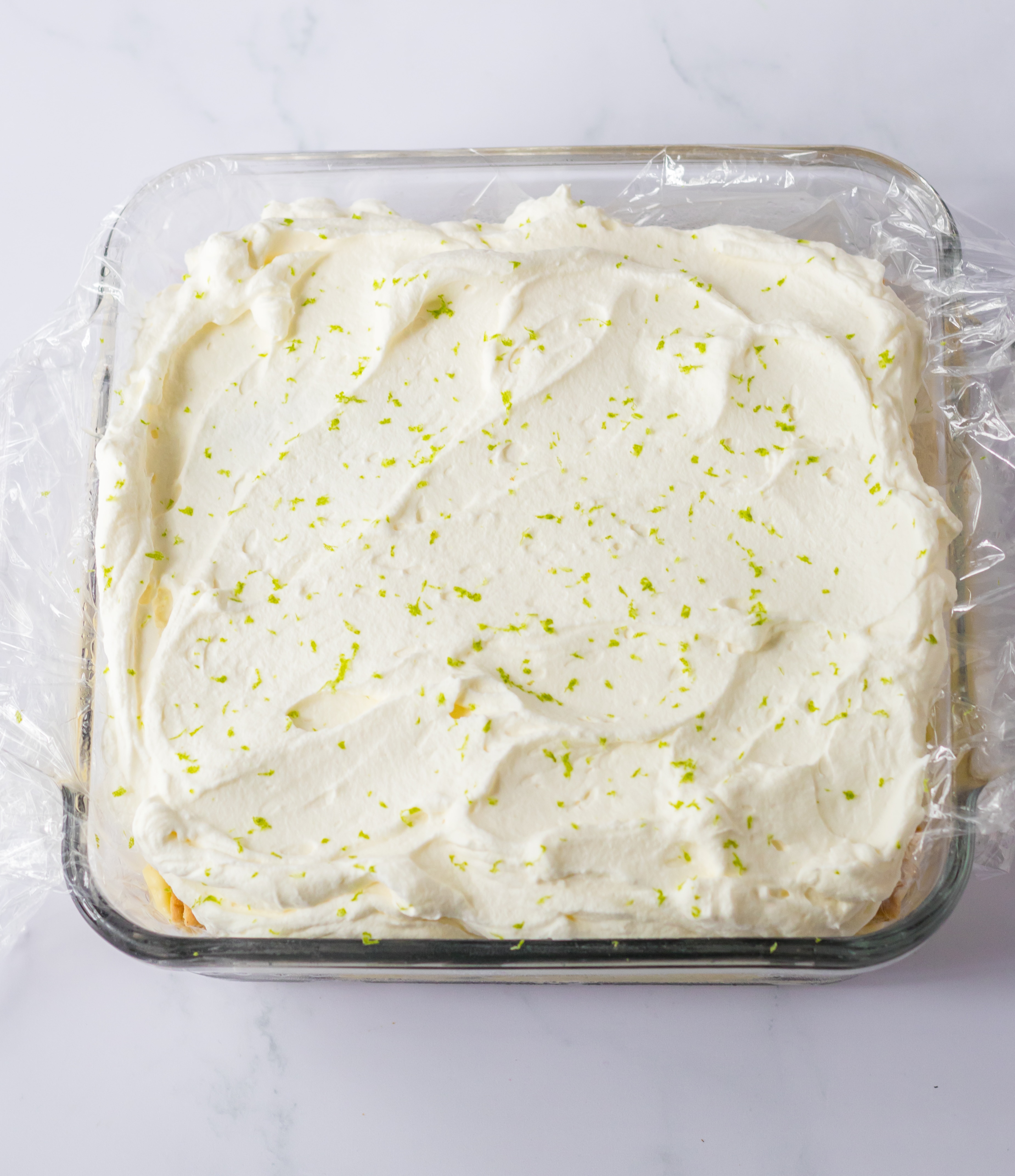 - Spread the whipped topping on the top of the cake and garnish with lime zest and lime slices if desired.