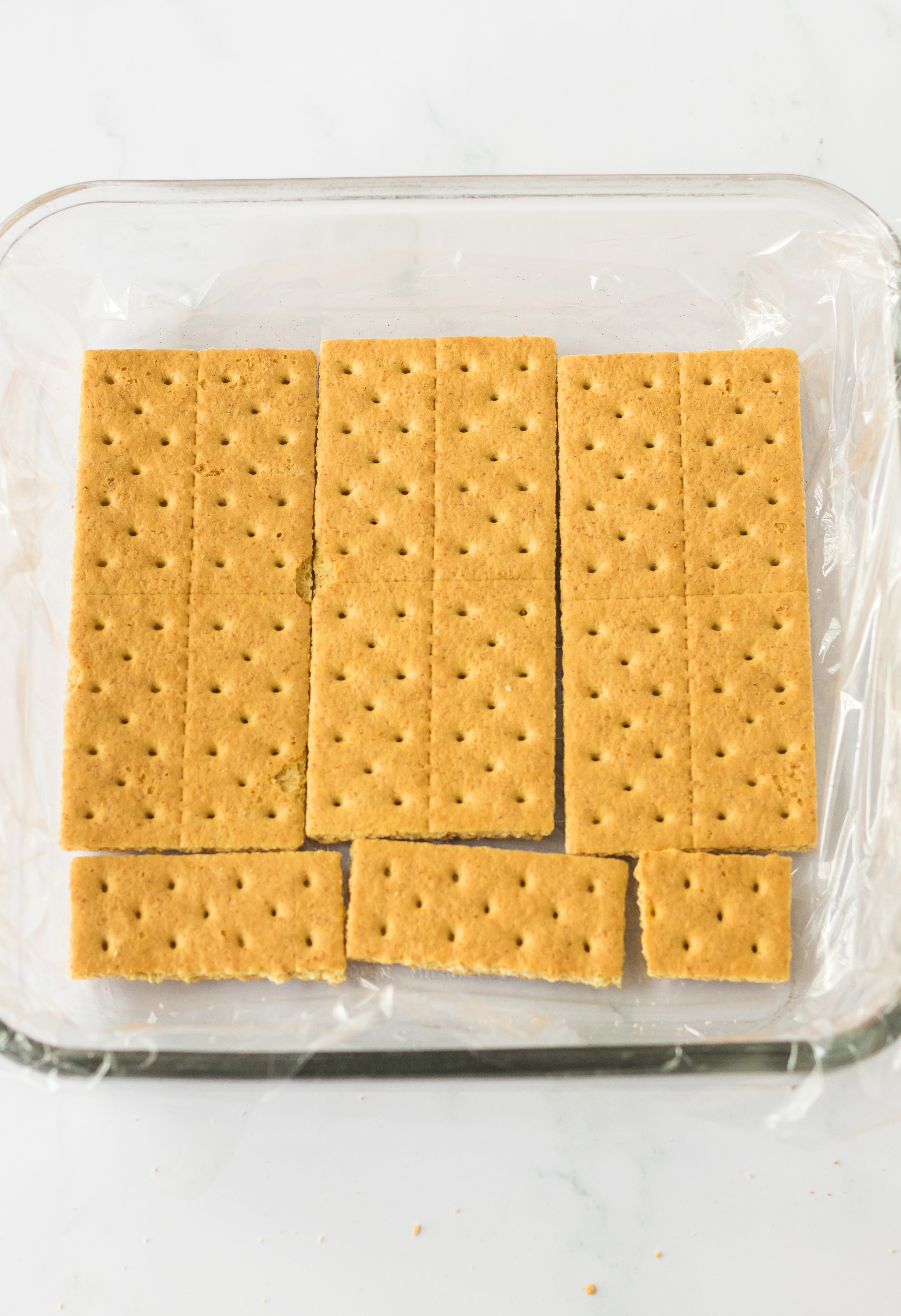 - Place your graham crackers down the bottom of the pan, I did 3 across and then broke apart some to fit the end of the pan.