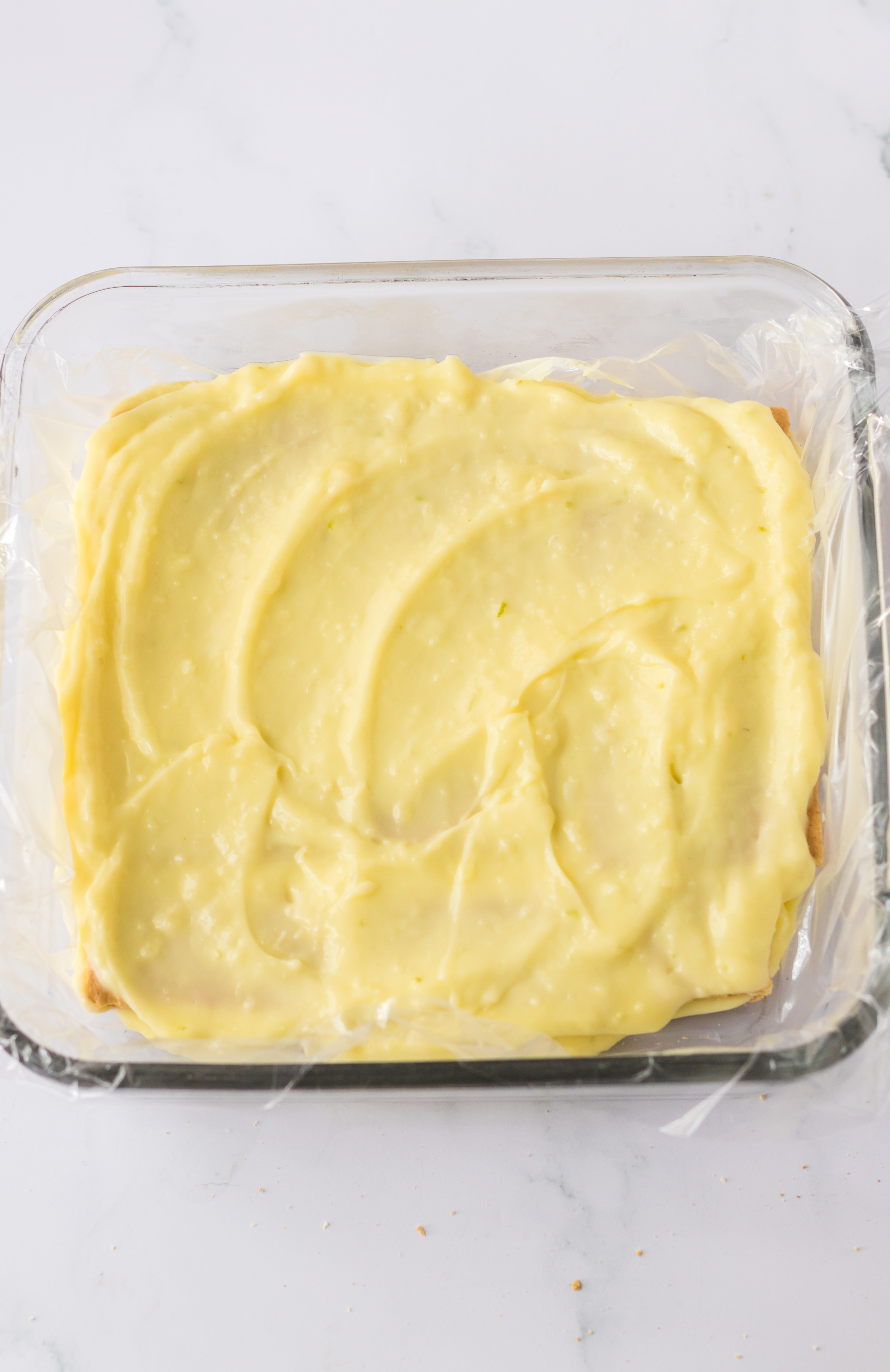 - Spoon 3/4 cup of the custard over crackers and spread over the crackers.