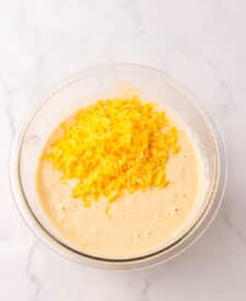 - To a large mixing bowl whisk together your pancake mix, water, cheese and syrup until well combined.