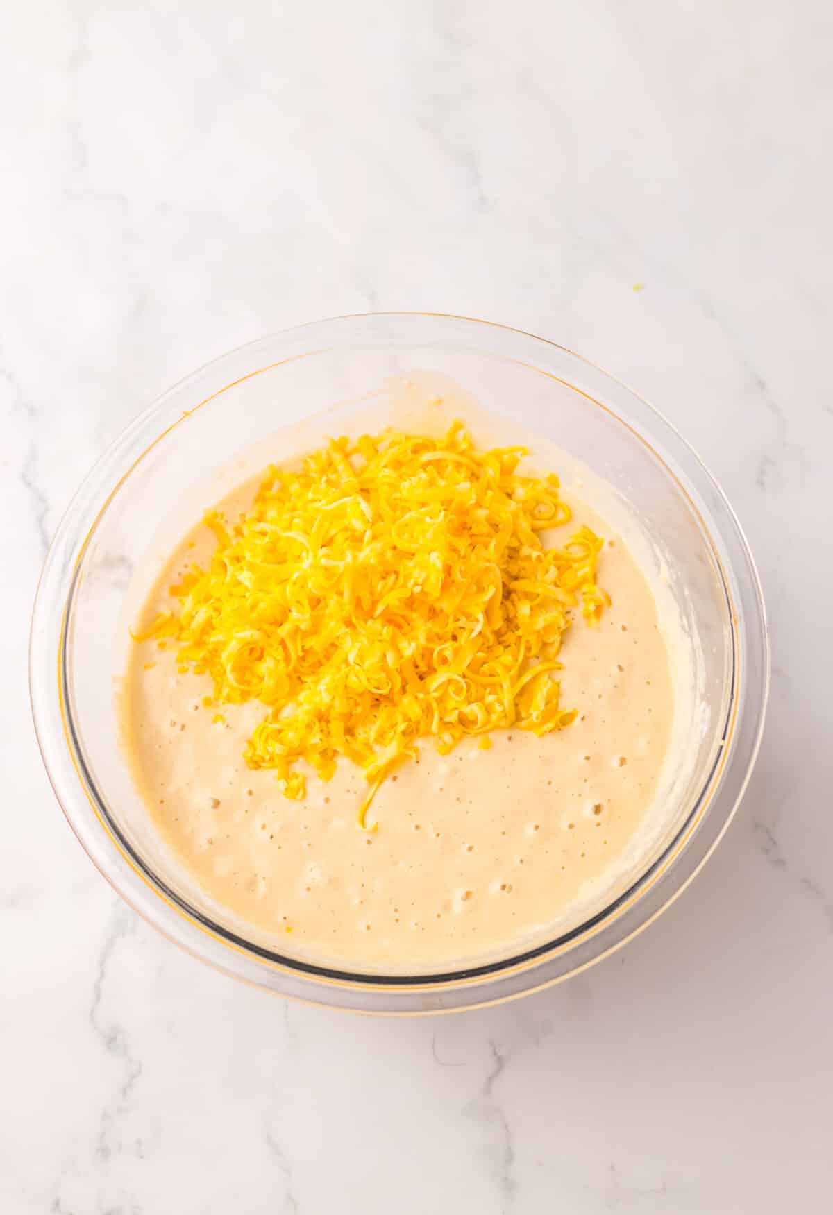 Mix the batter: In a large mixing bowl, whisk together the pancake mix, water, shredded cheese, and maple syrup until combined.