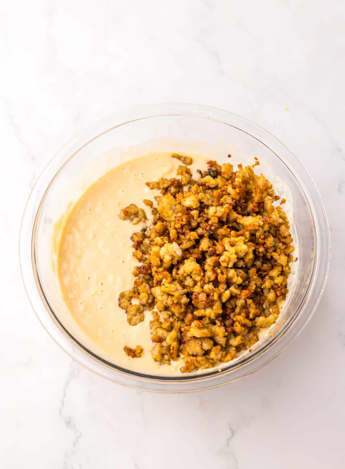 Cook the sausage: In a medium skillet over medium-high heat, brown and crumble the breakfast sausage until fully cooked. Drain the grease and set aside.
