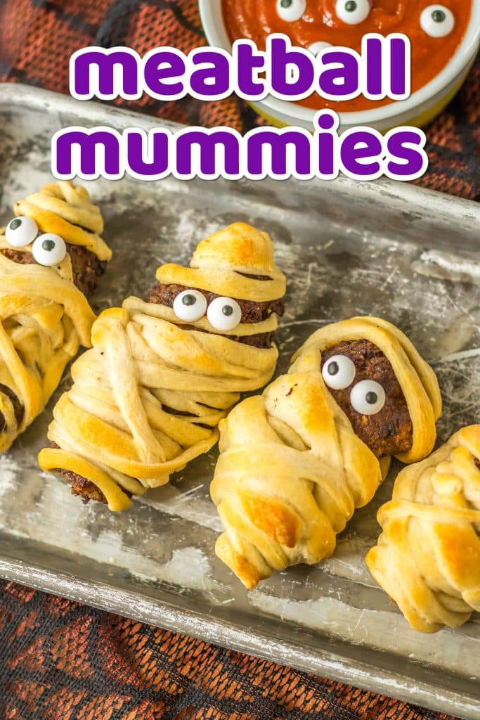 These Meatball Mummies are a perfect spooky dinner. Delicious savory meatball mix get wrapped up like little mummies with crescent roll dough and baked to perfection before getting dunked in marinara.
