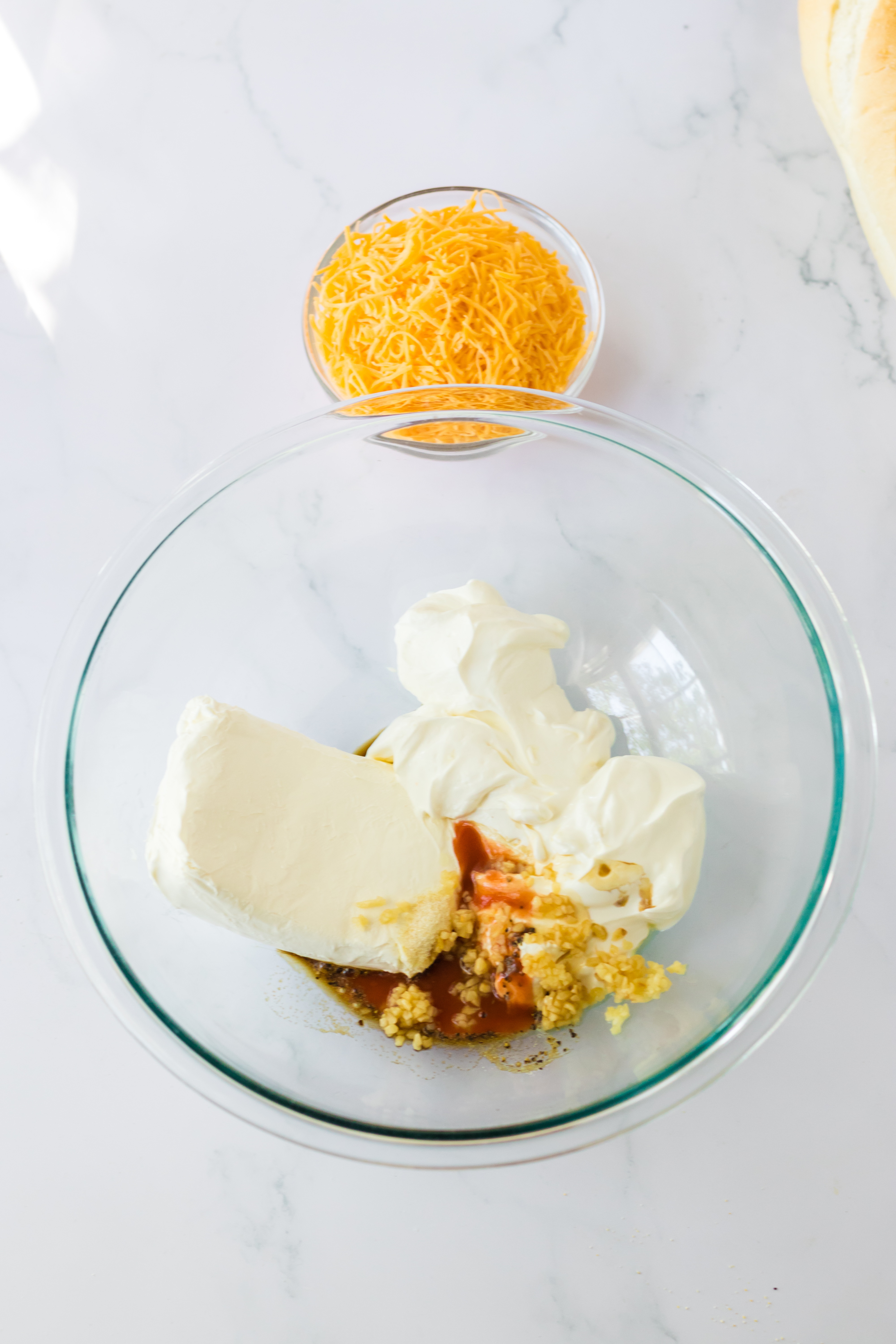 - In a large mixing bowl combine the cream cheese, sour cream, hot sauce, garlic, worcheshire sauce, onion powder and pepper.