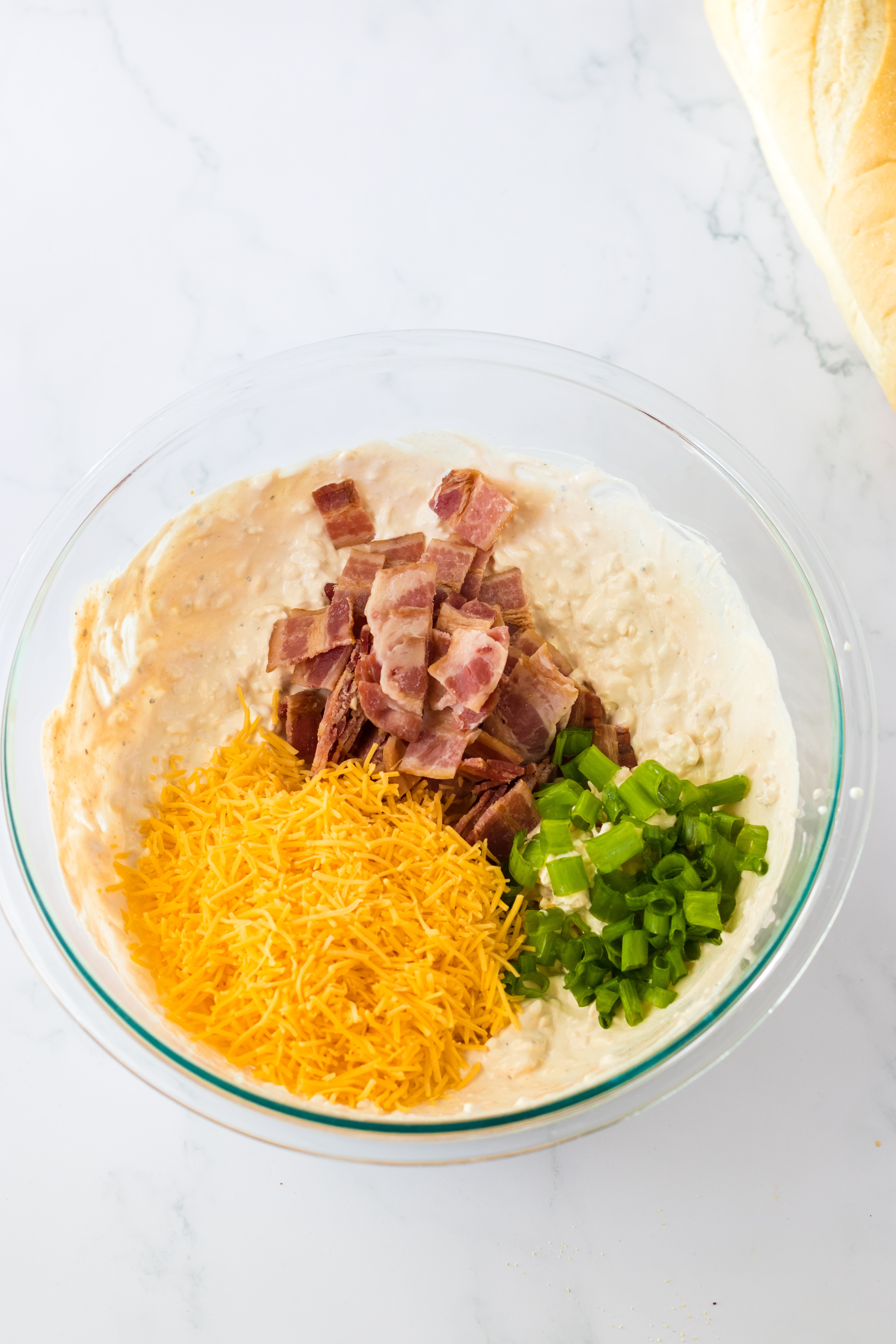 - Once well mixed stir in the cheddar, bacon and scallions into the cream cheese mixture.