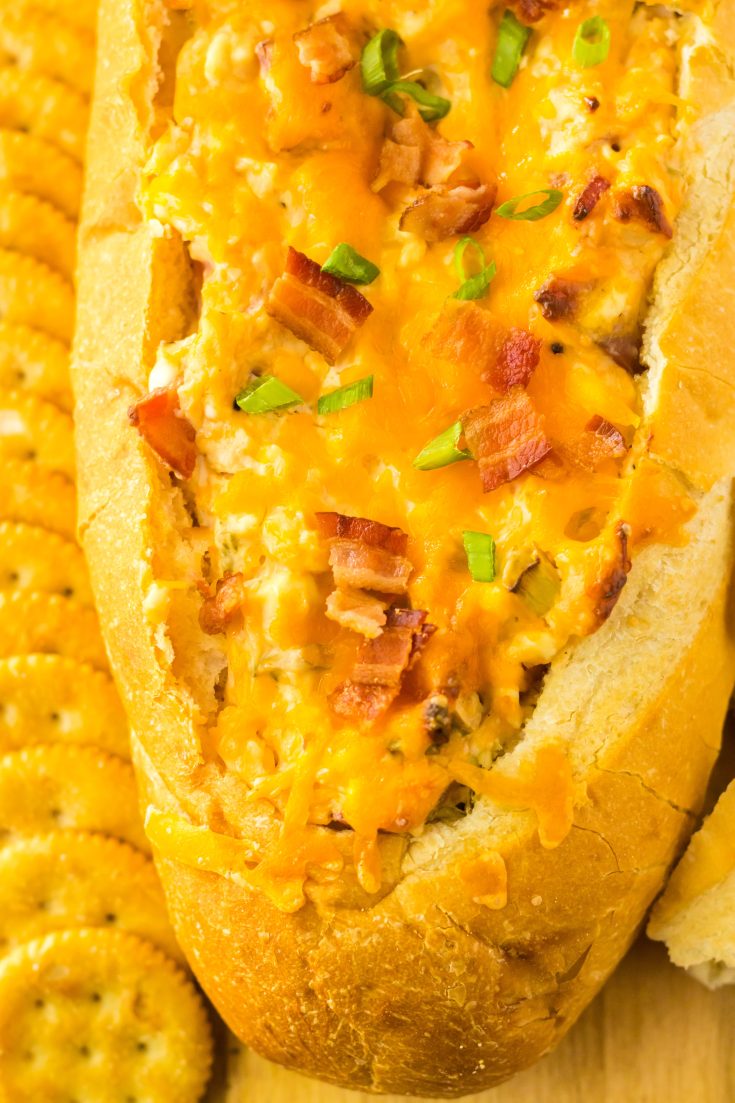 There is nothing I love more than a fabulous, cheesy appetizer and this dip is perfect. Lots of melty cheese bakes right in a bread bowl. This is always one of our favorite dips. I love that this dip comes together so quick, just mix everything together in one bowl and then stuff it into a hollowed-out loaf of french bread and bake until its perfectly melty. This dip is always the first thing to go on the party table. Everyone loves it!! Bacon, cream cheese, sour cream, garlic and cheddar cheese all got together to create this melty dip perfection. Dips served in a bread bowl are always popular and always impressive and this one is no exception. It is also so easy! You will be the hit of the parties with this dip and no one will know it was so easy! The most popular appetizers are always cheesy dips. This is the perfect party dip. I love that you can customize this dip by changing the cheese, adding some spice or your favorite seasonings, you can totally make this recipe your own. You can also just serve this dip in a baking dish if you like. This creamy dip is full of salty bacon and cheesy goodness stuffed inside a hollowed-out loaf of bread. This dip feeds a lot but you might want to make two because I promise you there will be nothing left but crumbs! I made this last summer for when we were hanging around the pool and it was gone in minutes!! So the next time you are having a get together, potluck or going to a party this is the dip to make! It makes the perfect snack. I promise your whole family will love this Mississippi Sin Dip Recipe.