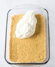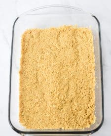 - Press the cookie crumbs into the bottom of a 9×13 glass baking dish.