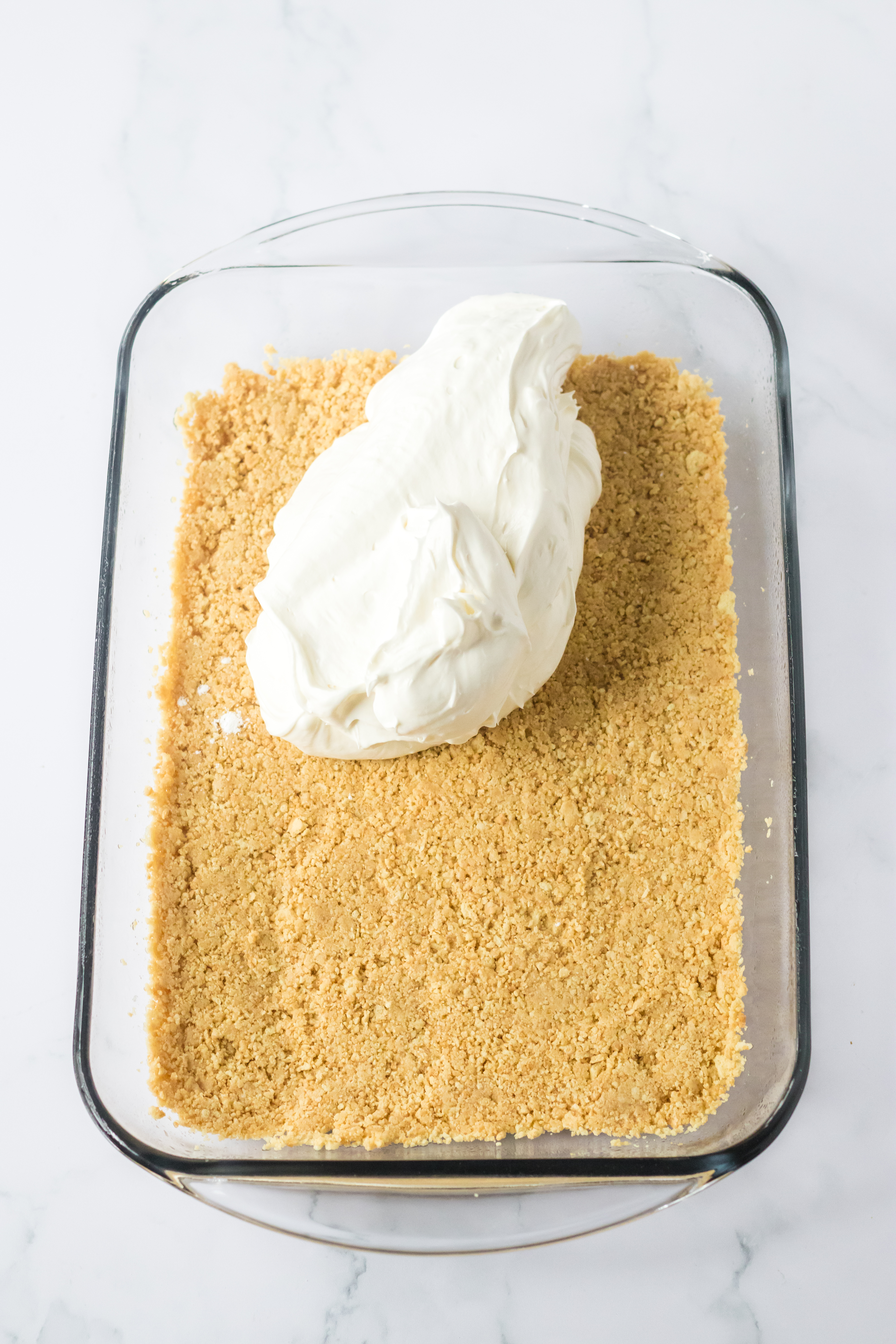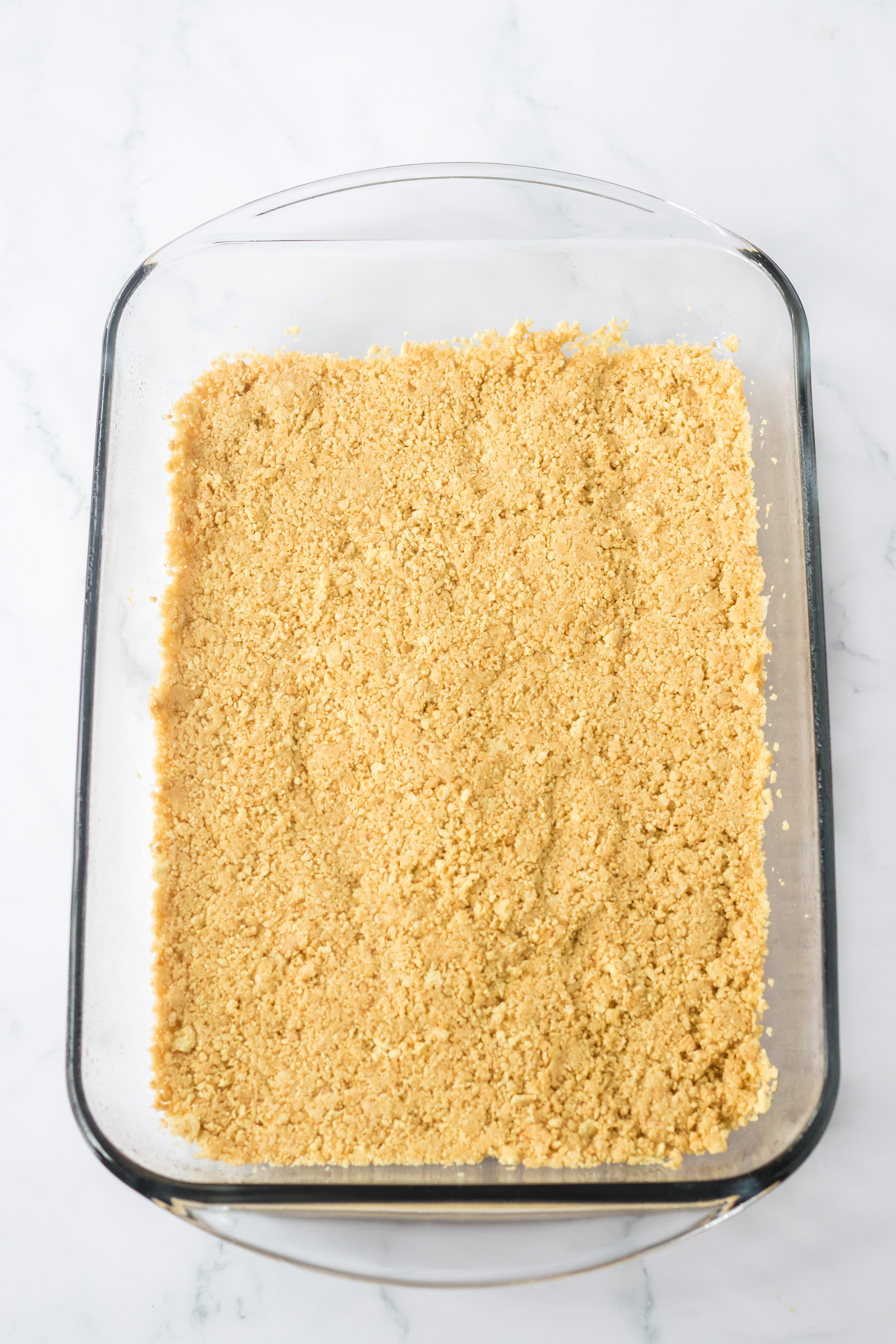 - Press the cookie crumbs into the bottom of a 9×13 glass baking dish.