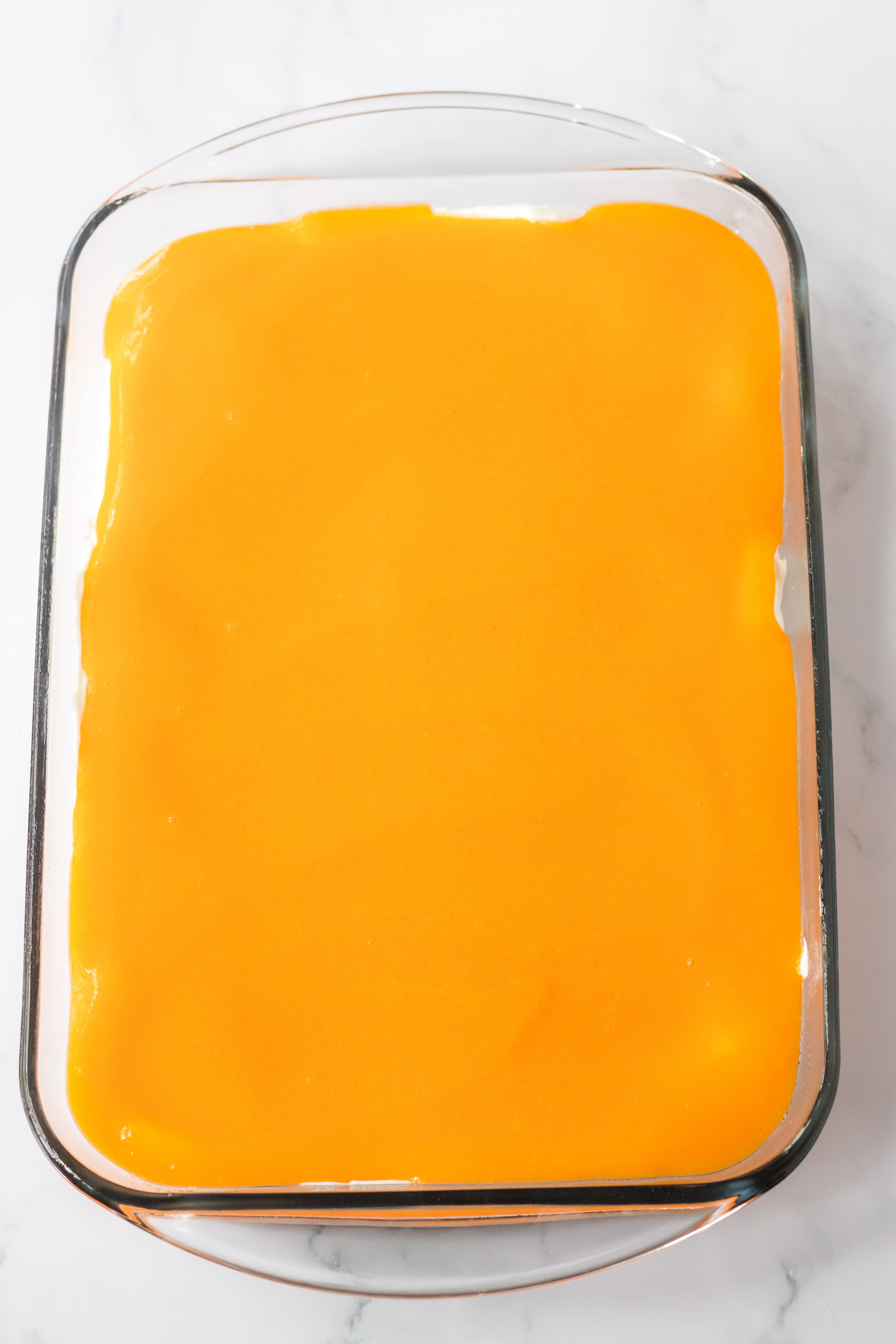 - Spread the orange jello/pudding layer over the cream cheese layer.