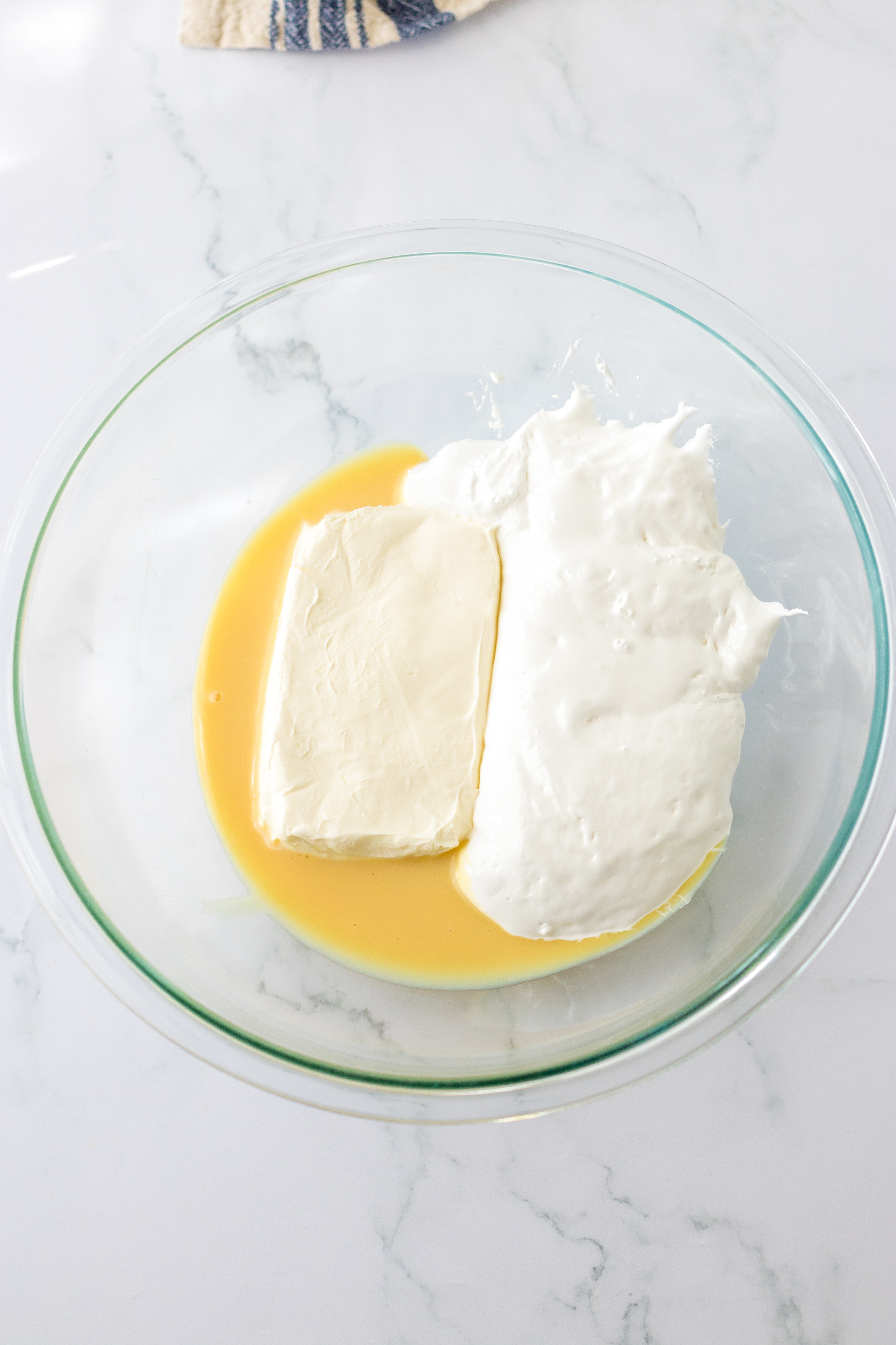- Beat the marshmallow creme, cream cheese and sweetened condensed milk into the jello mixture until blended.