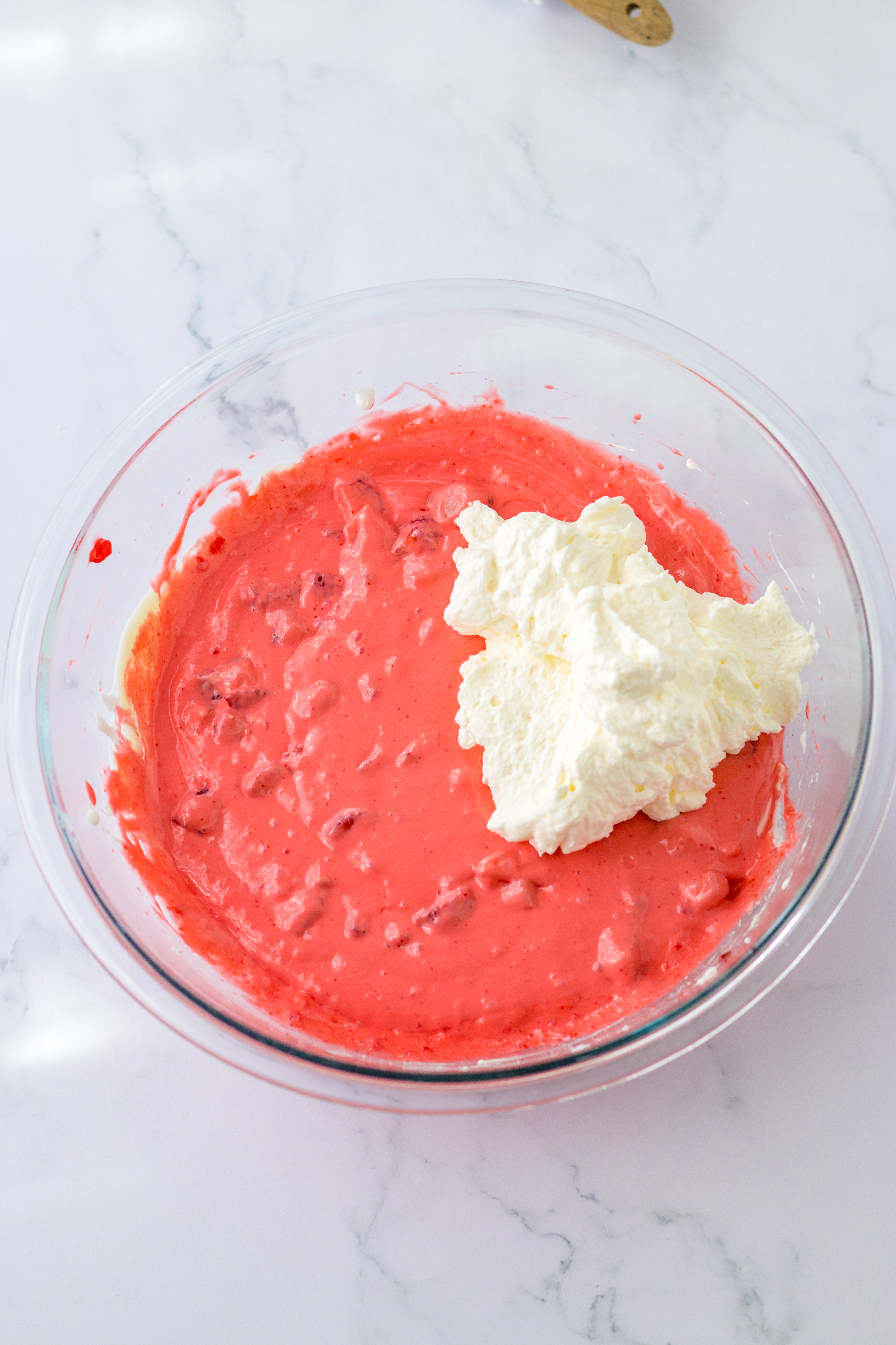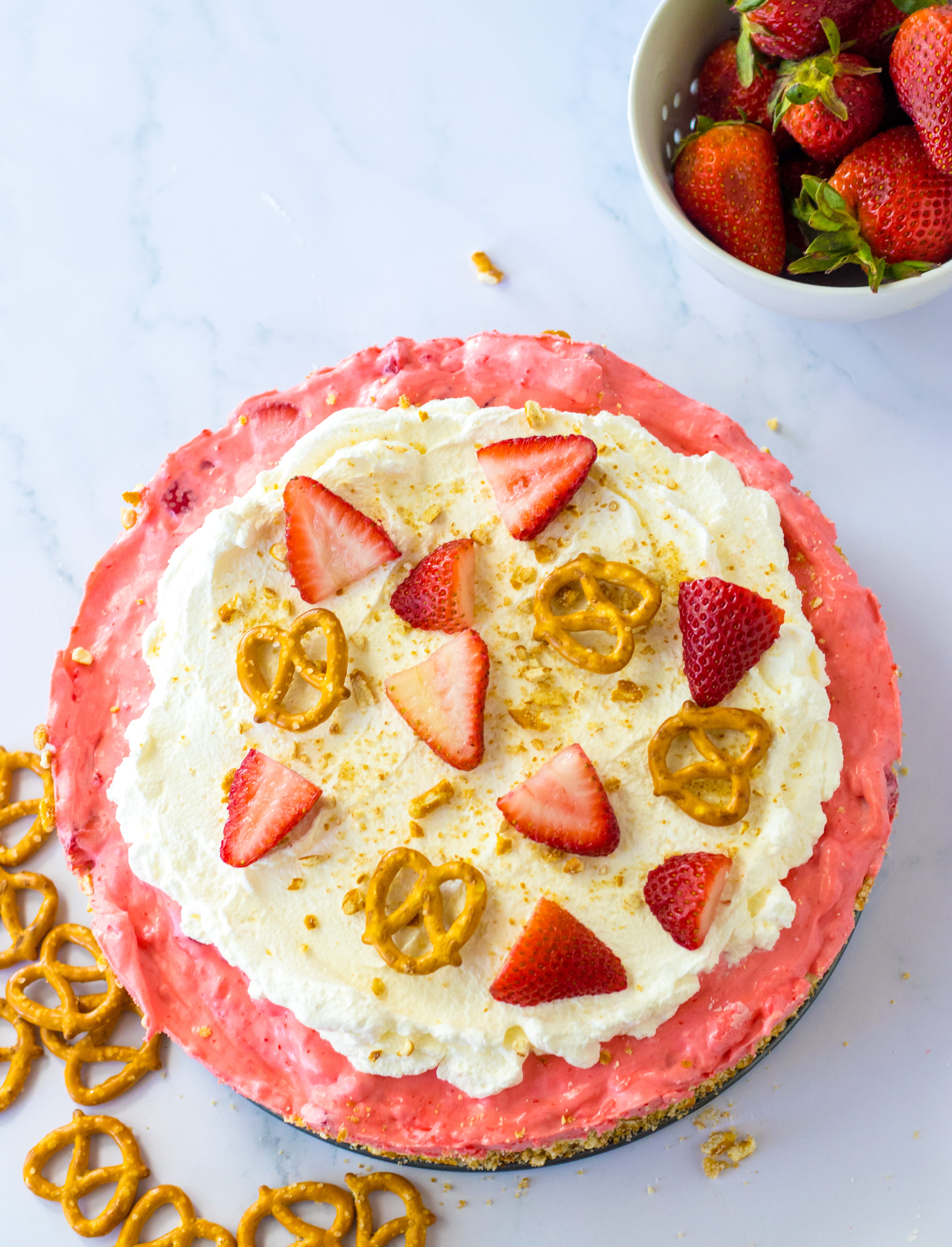 This fabulous pie starts with a simple pretzel crust, a creamy strawberry layer, and a whipped topping.