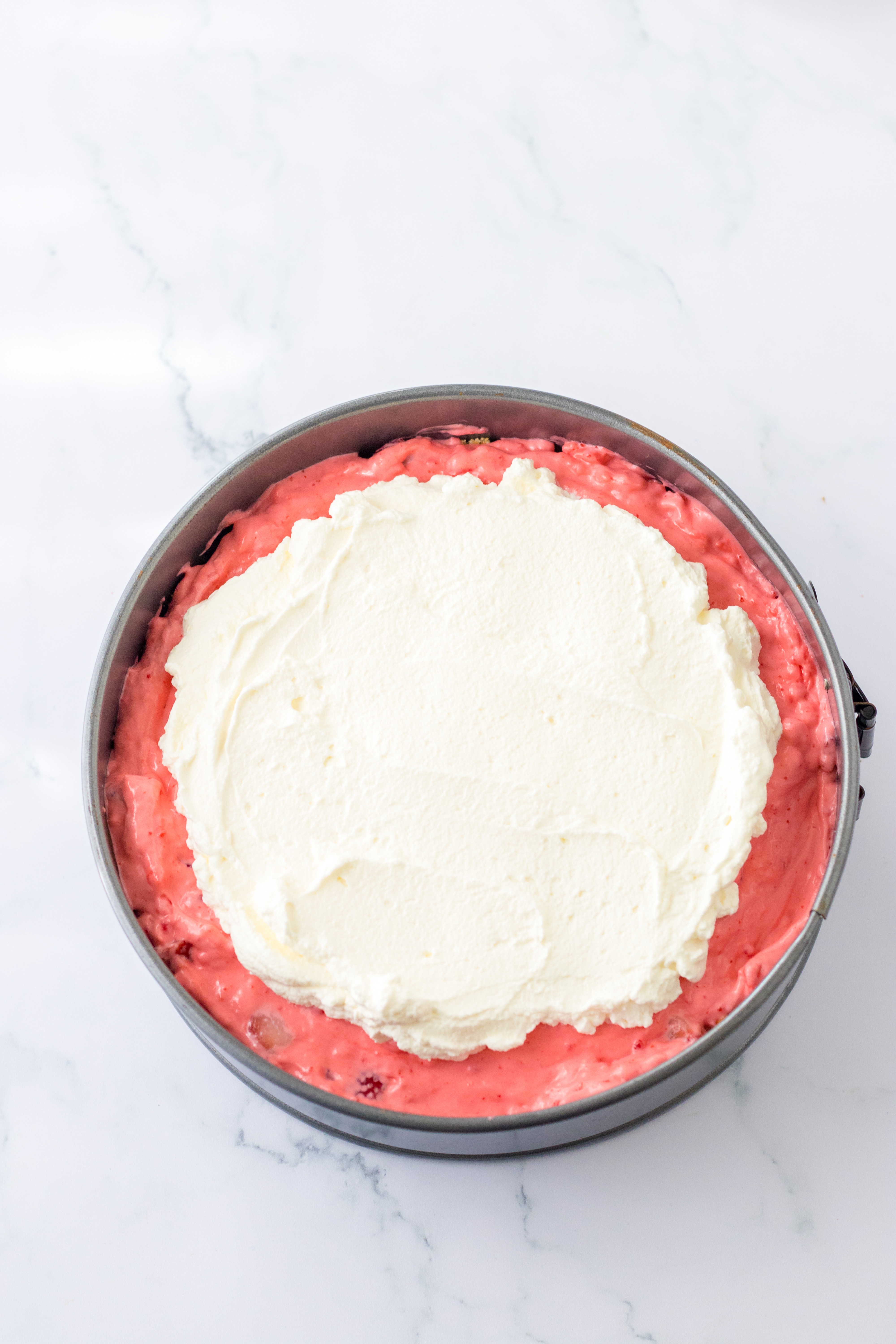 I always want to bring the best, most delicious dessert to every gathering and this one has always impressed and always disappears first. It just looks so gorgeous with it’s strawberry layer and just looks so bright, refreshing and summery.