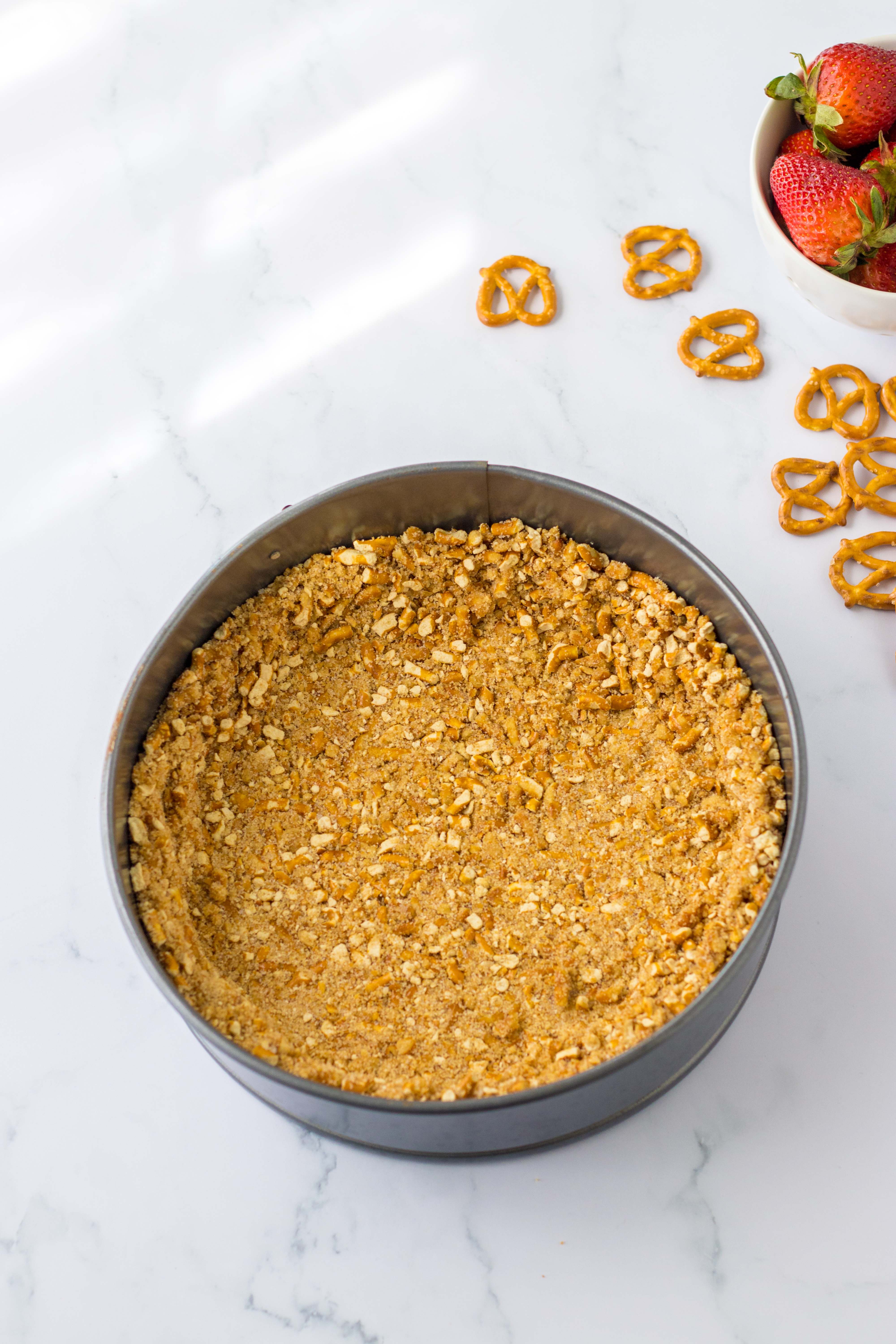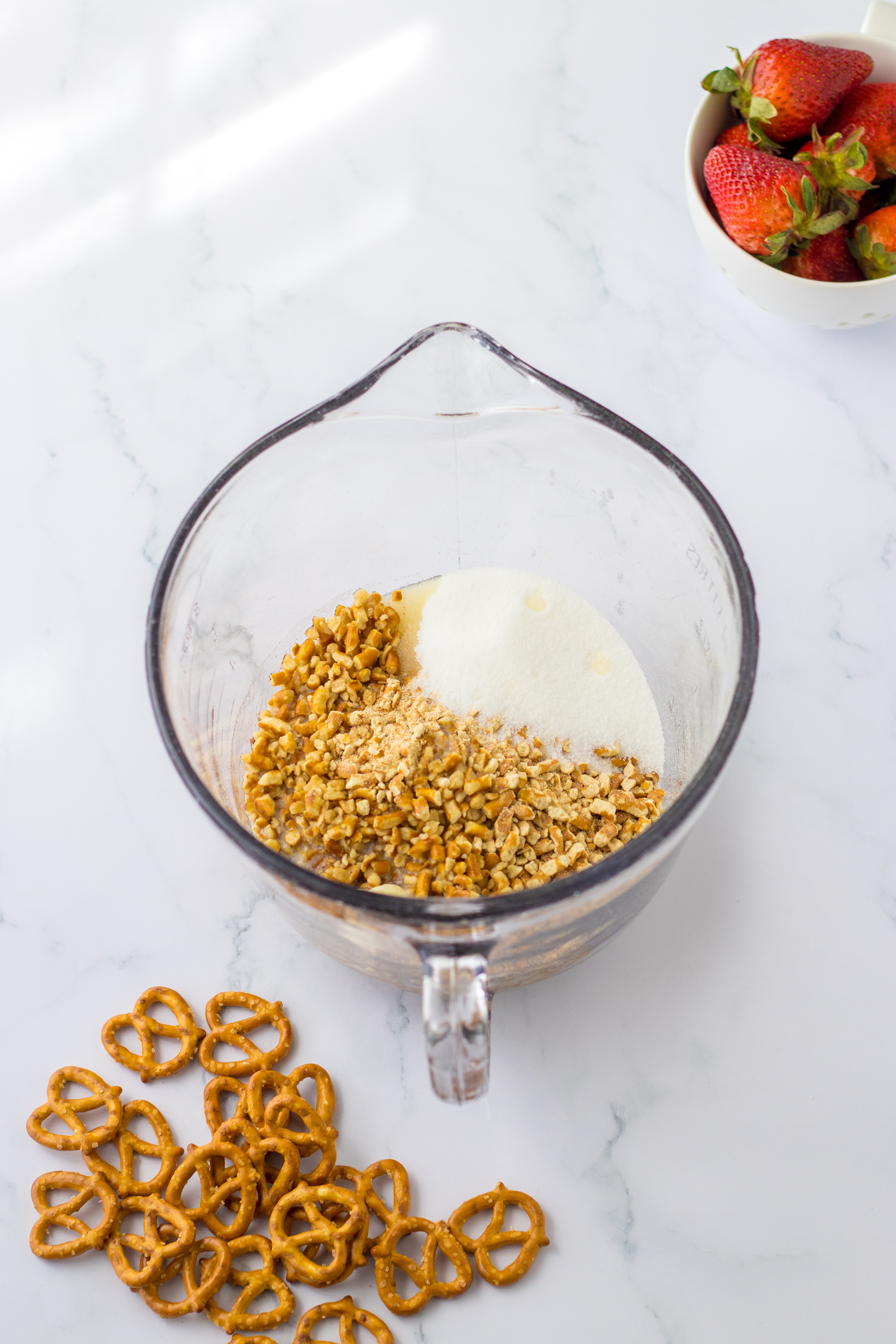 - Crush the pretzels either in a food processor or in a ziploc bag with a rolling pin.