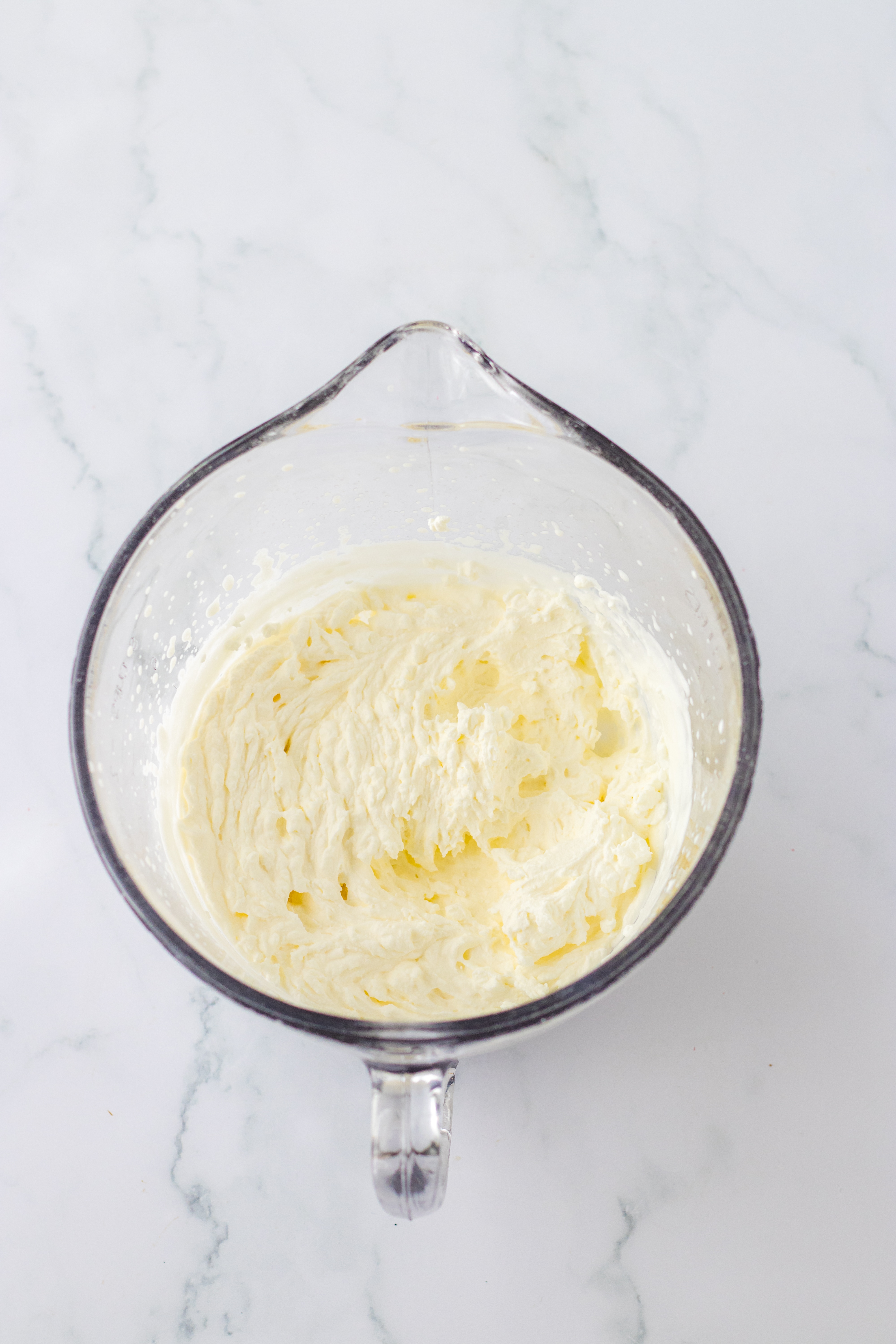 - In another bowl whip 1 cup heavy cream to form stiff peaks.