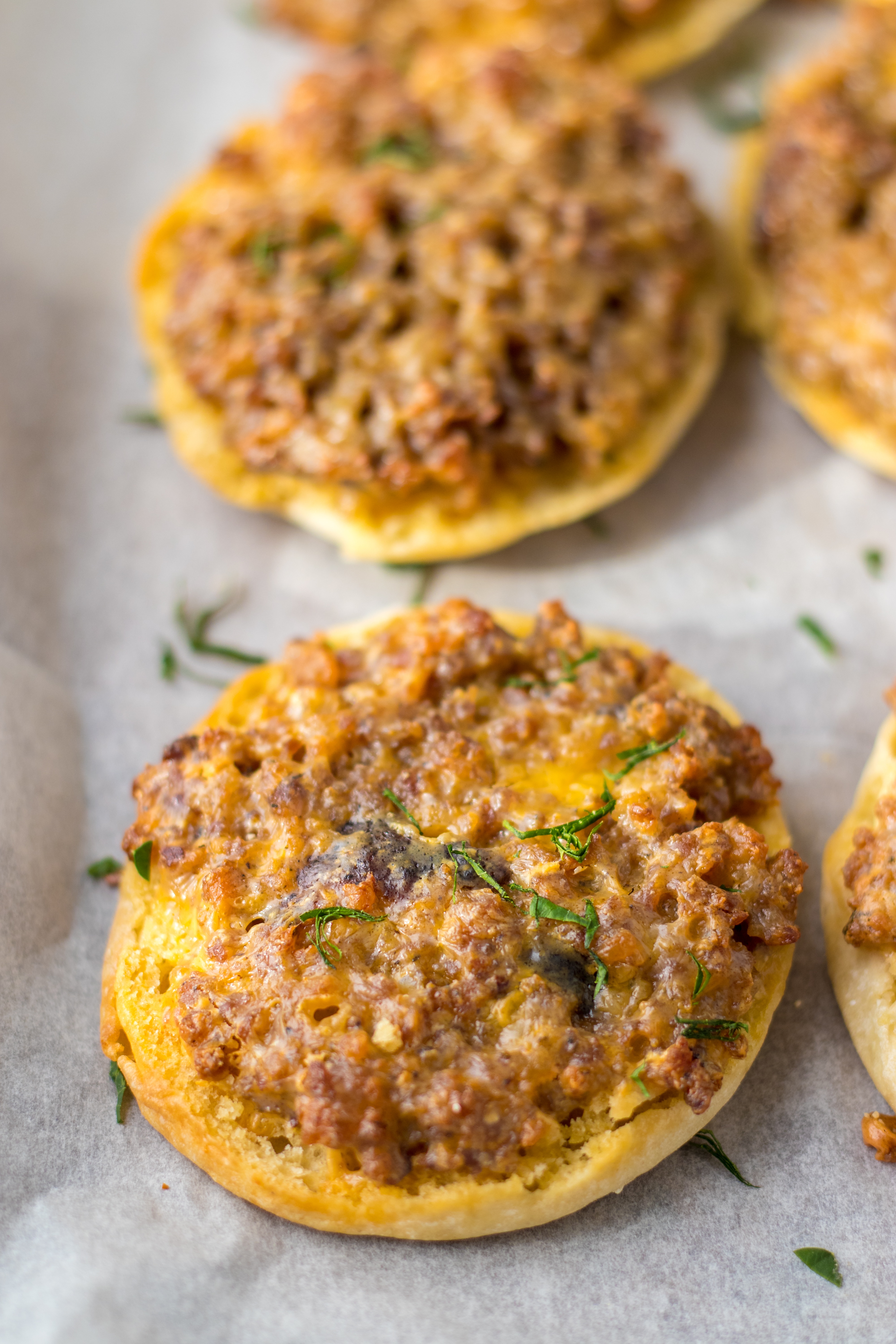 Close up of Old English Sausage Muffins. Sausage and cheese baked into an english muffin
