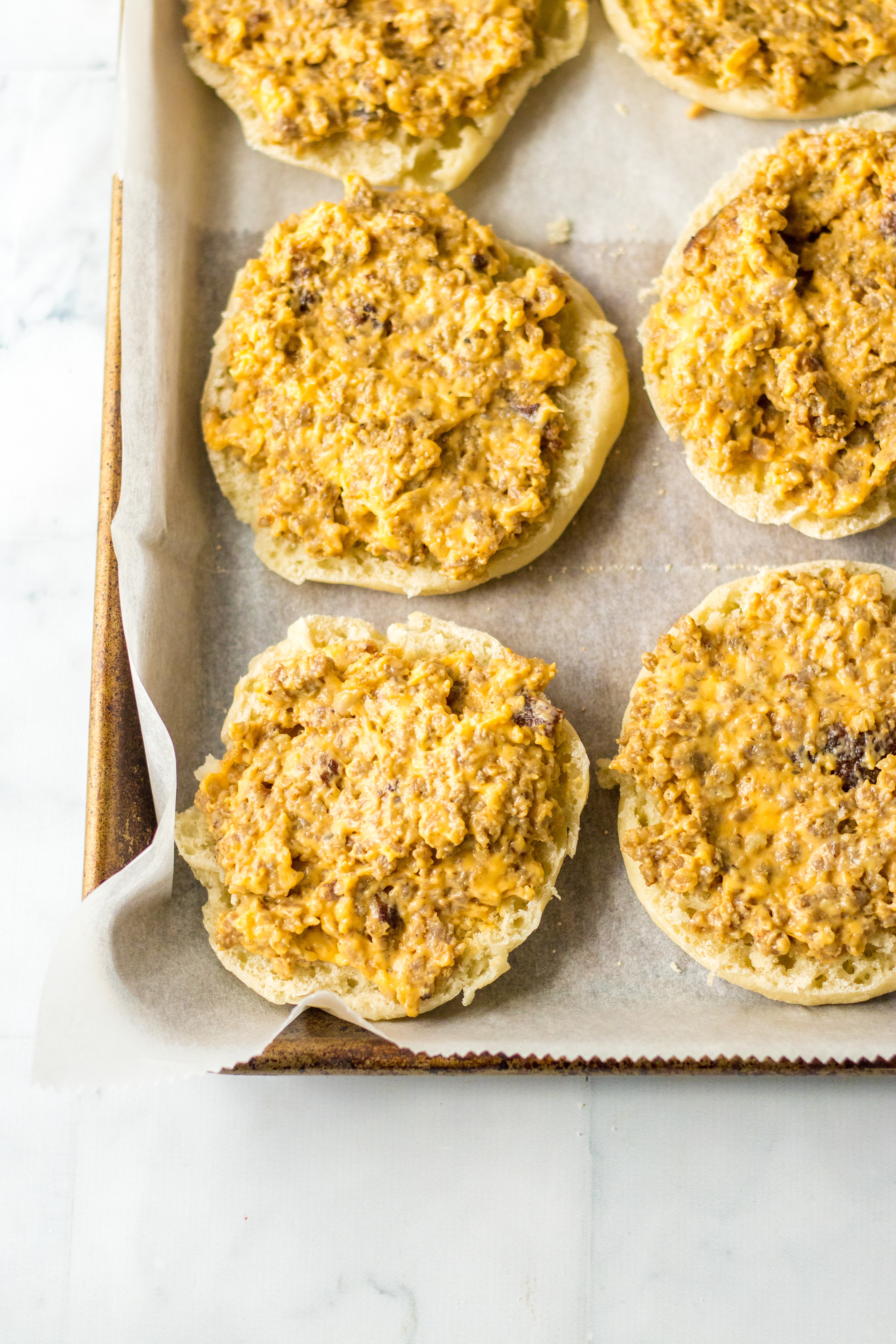4. Evenly divided the sausage mixture between all the muffins and spread out.