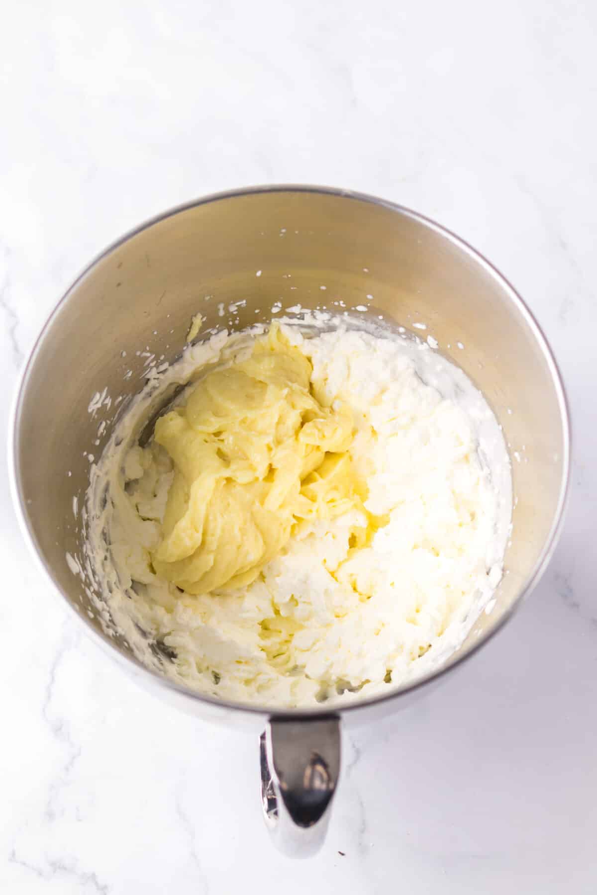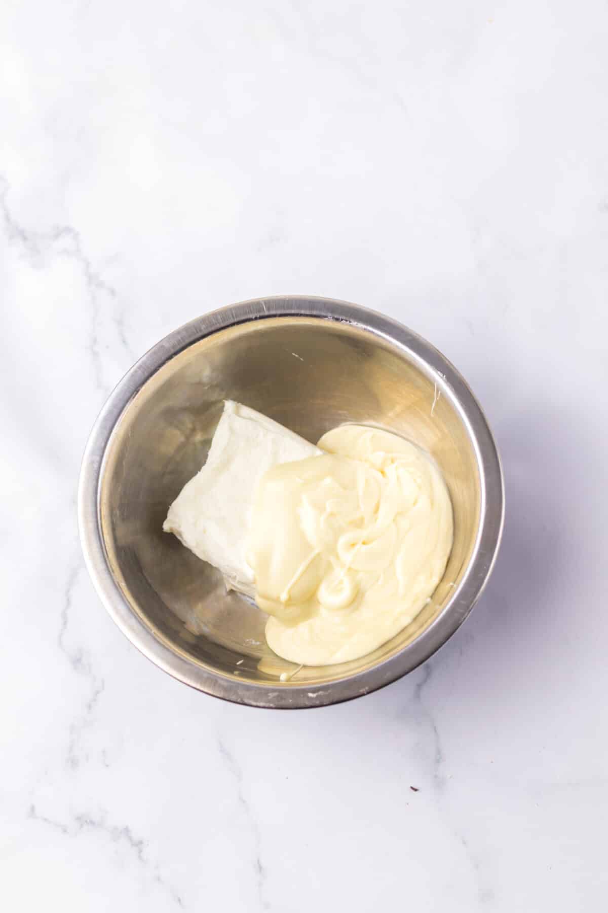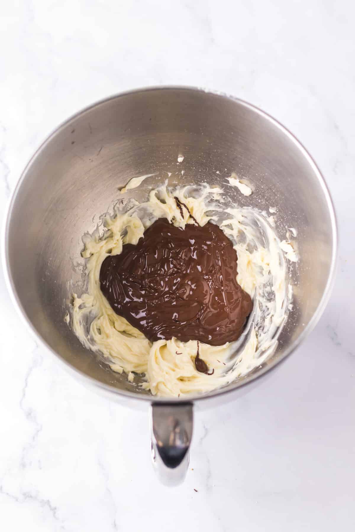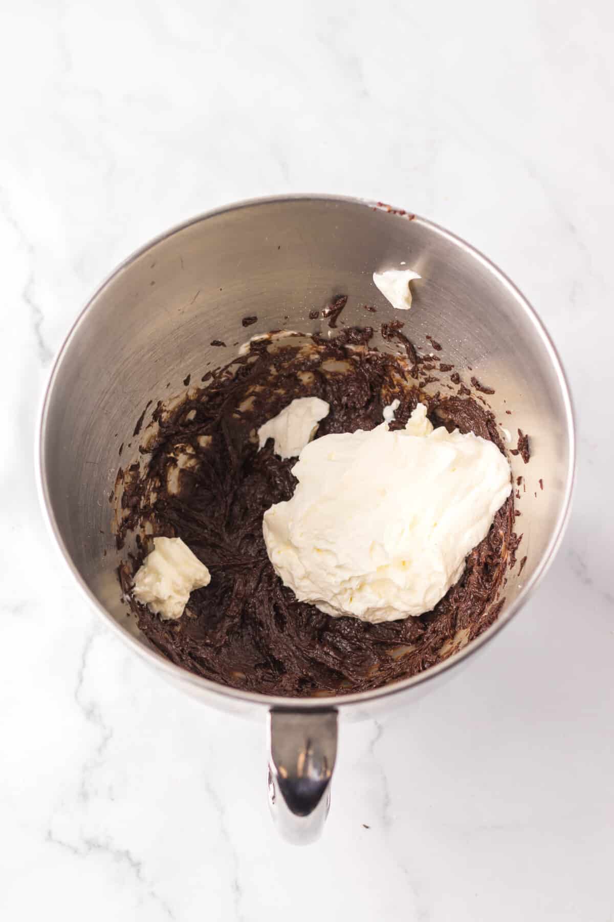 - In a separate bowl, beat the cream cheese and melted white chocolate until smooth.