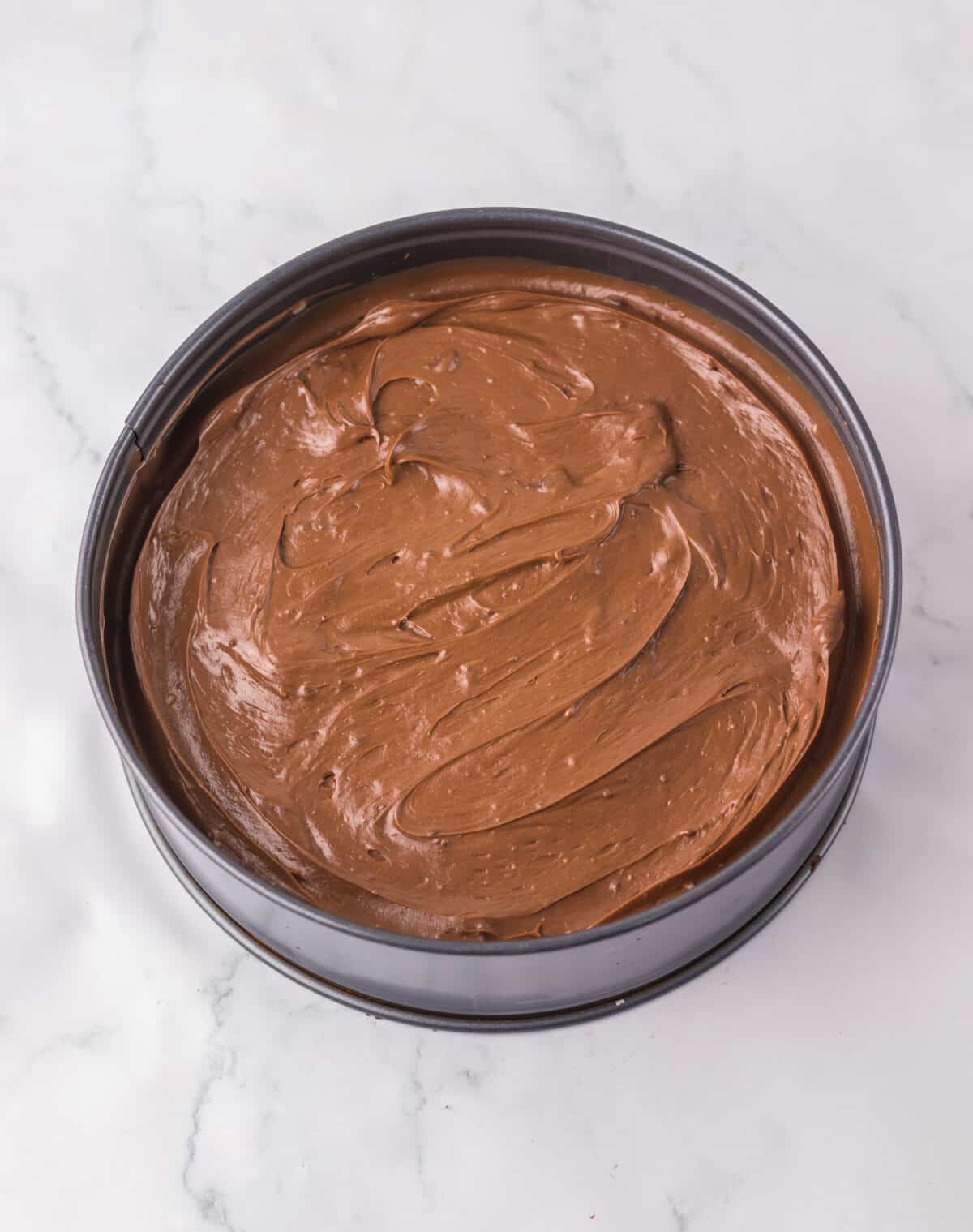 - Spread the chocolate cheesecake mixture over the cake layer. Refrigerate for 1 hour or freeze for 30 minutes. I go the freezer route because it is faster.