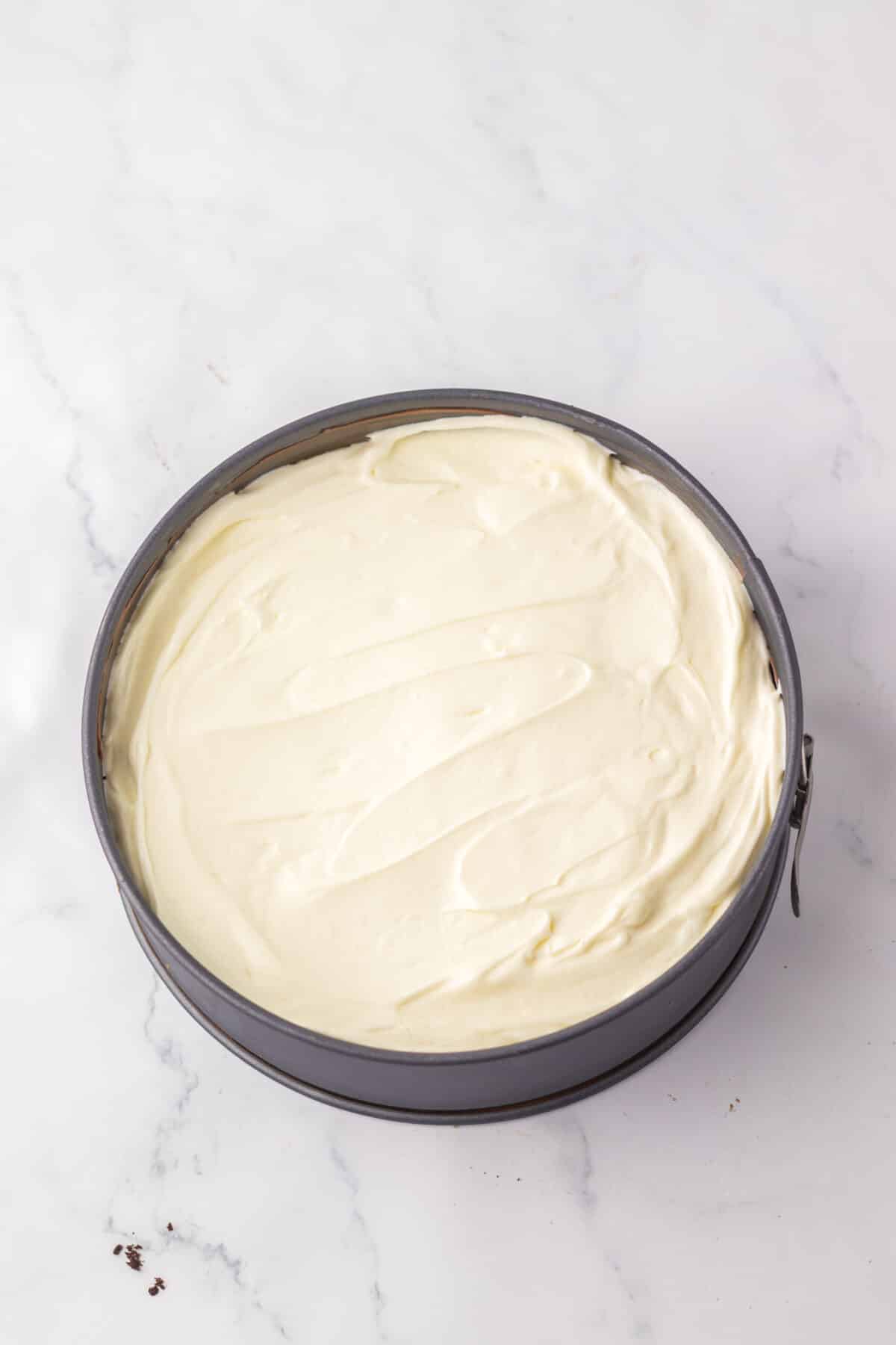 - Spread the white mousse layer over the chocolate cheesecake layer.
