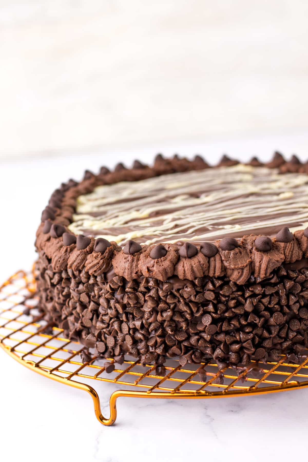 - Press mini chips around the sides. Drizzle melted white chocolate over top.