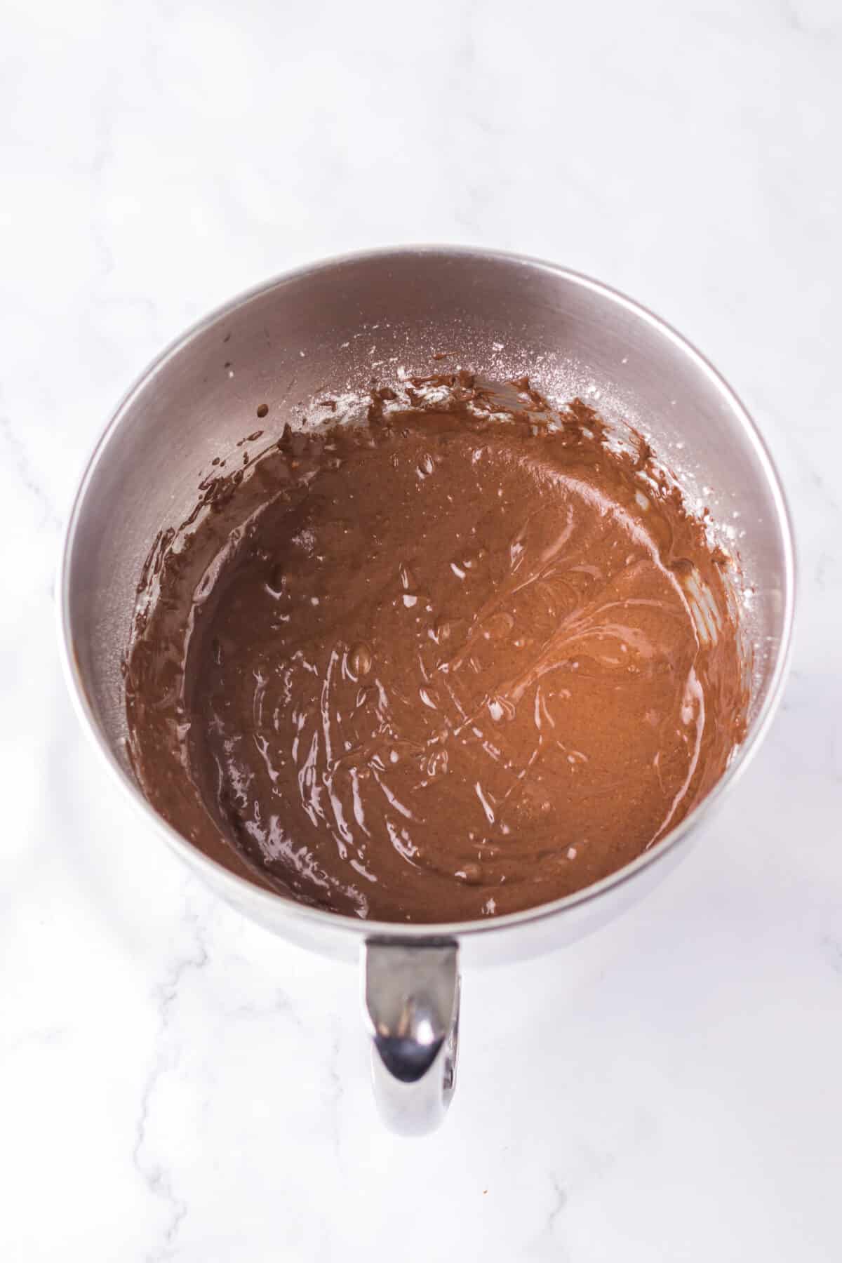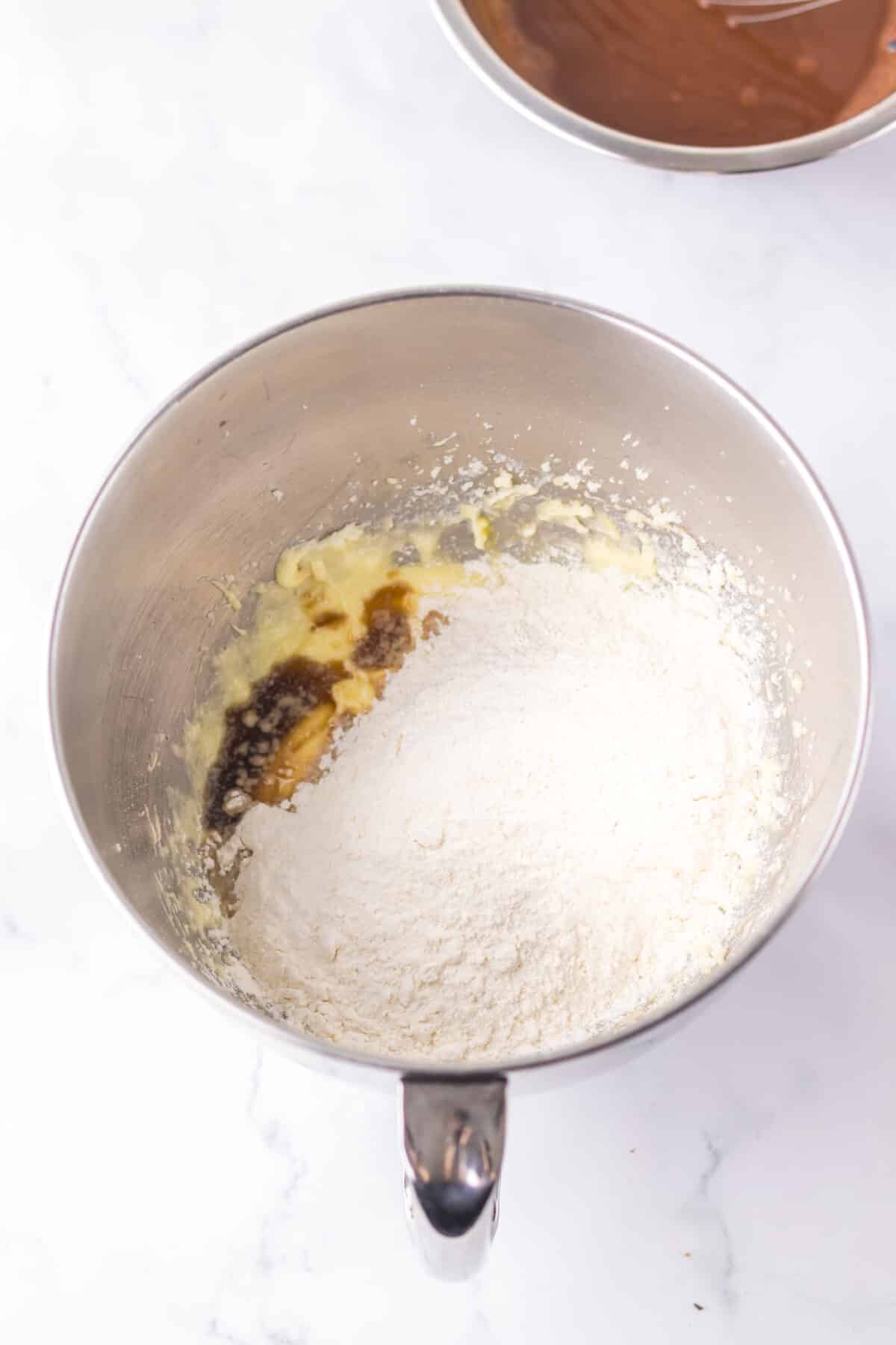 - Mix in flour, baking soda, and baking powder. Stir in cooled cocoa mixture.