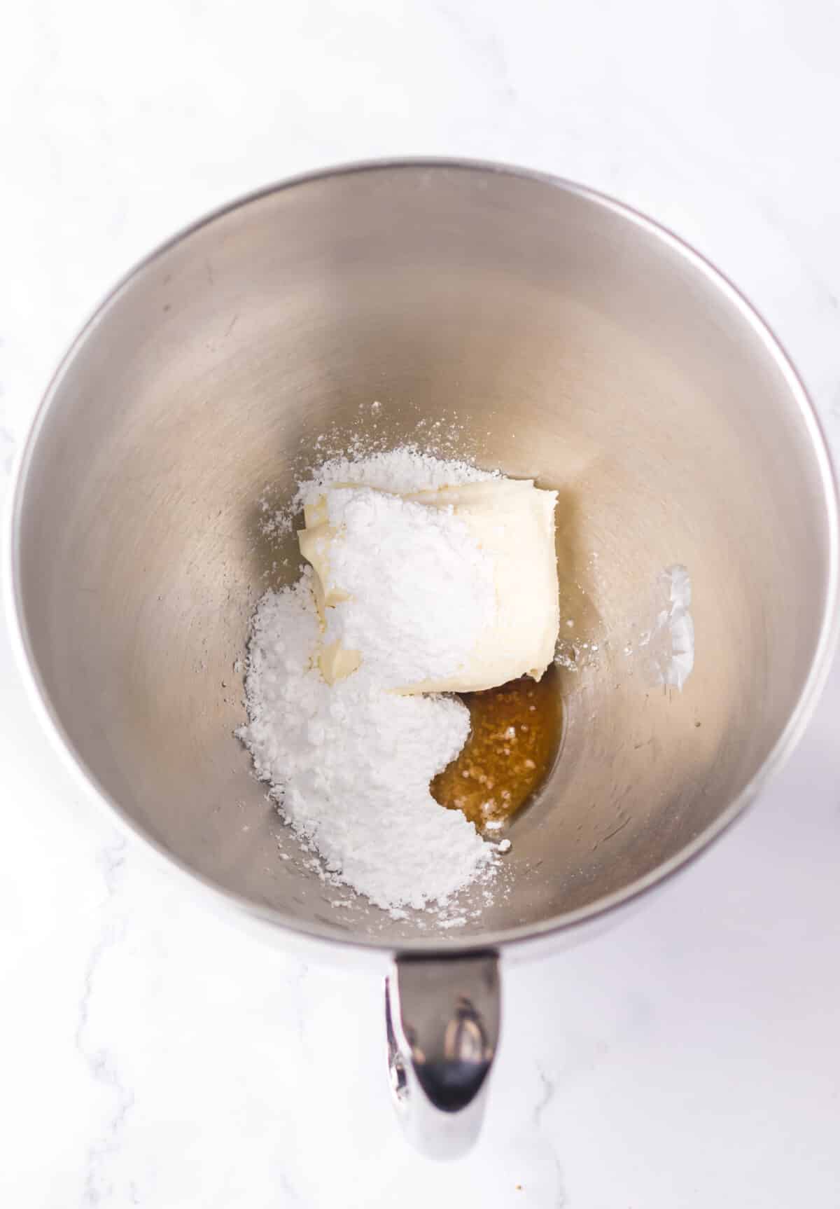 - For the chocolate cheesecake layer, in a small bowl, beat the cream cheese, powdered sugar and vanilla until smooth.