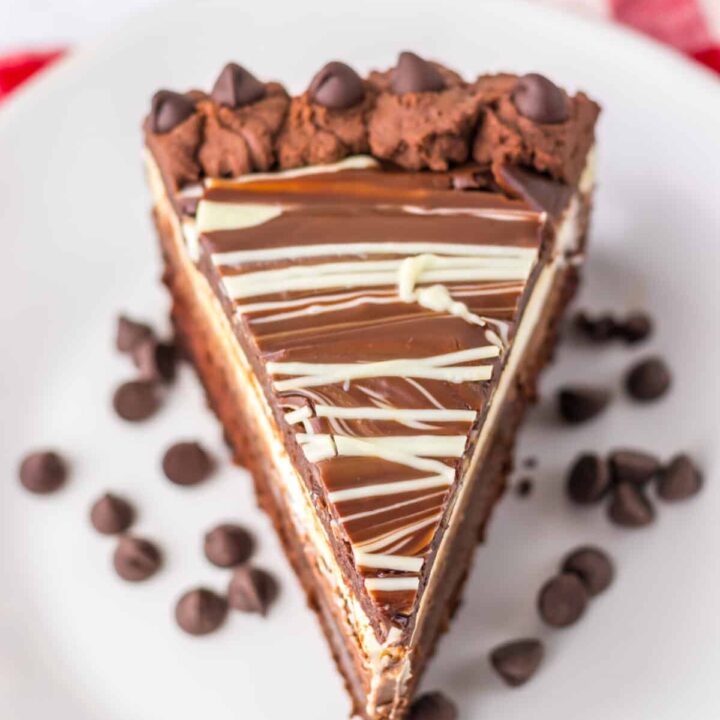 No meal at Olive Garden would be complete without dessert and this Copycat Olive Garden Black Tie Mousse Cake is a stunning, impressive, rich dessert you can make right at home. A deep chocolate cake is the base layer, topped by a rich chocolate mousse layer, followed by an easy cheesecake mousse layer and the whole thing is topped with a perfect chocolate ganache. This is the ultimate dessert and a lot easier than you think. Perfect for entertaining.
